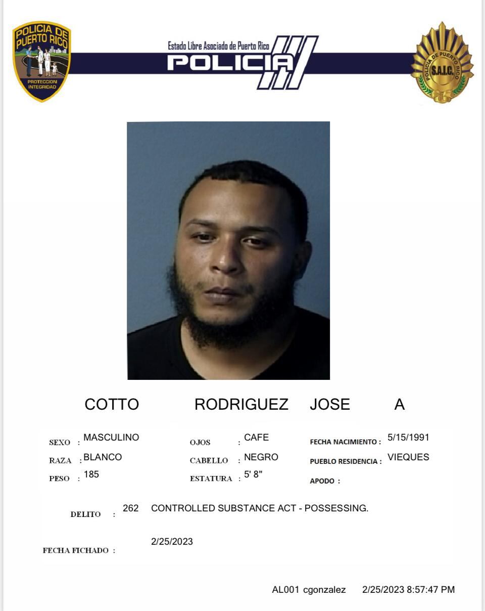 Según el reporte del Negociado de la Policía de Puerto Rico (NPPR), durante una intervención vehicular, a eso de las 3:45 de la tarde, arrestaron a José A. Cotto Rodríguez, de 31 años.