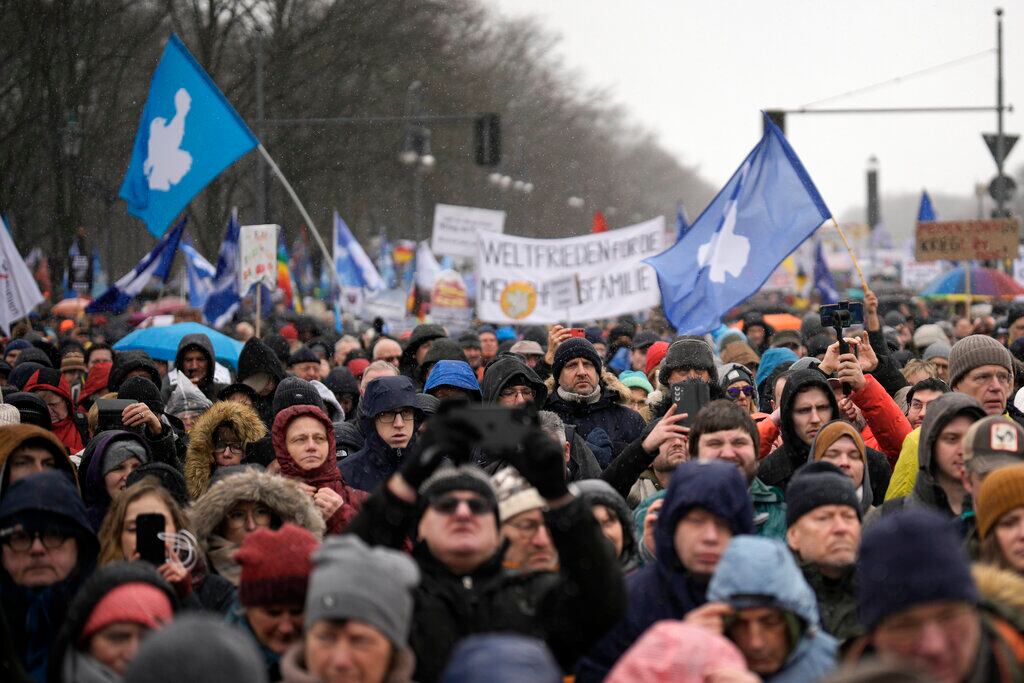 Miles de personas protestaron en Berlín el sábado para condenar el suministro de armas de Alemania a Ucrania y exigir un diálogo de paz para poner fin a la guerra.
