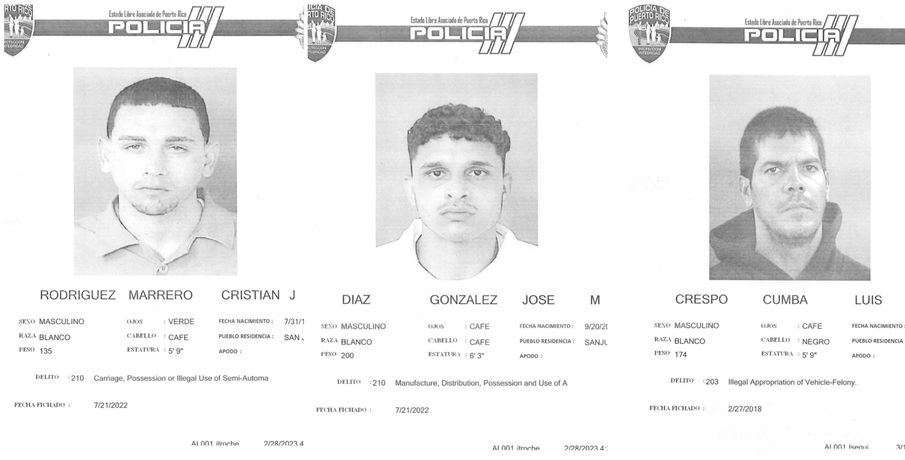 José Manuel Díaz González de 22 años, Christian J. Rodríguez Marrero de 28 años, Rafael Martínez Venero de 50 años y Luis Crespo Cumba de 46 años enfrentan cargos criminales por los delitos de asesinato en primer grado y ley de armas y conspiración.