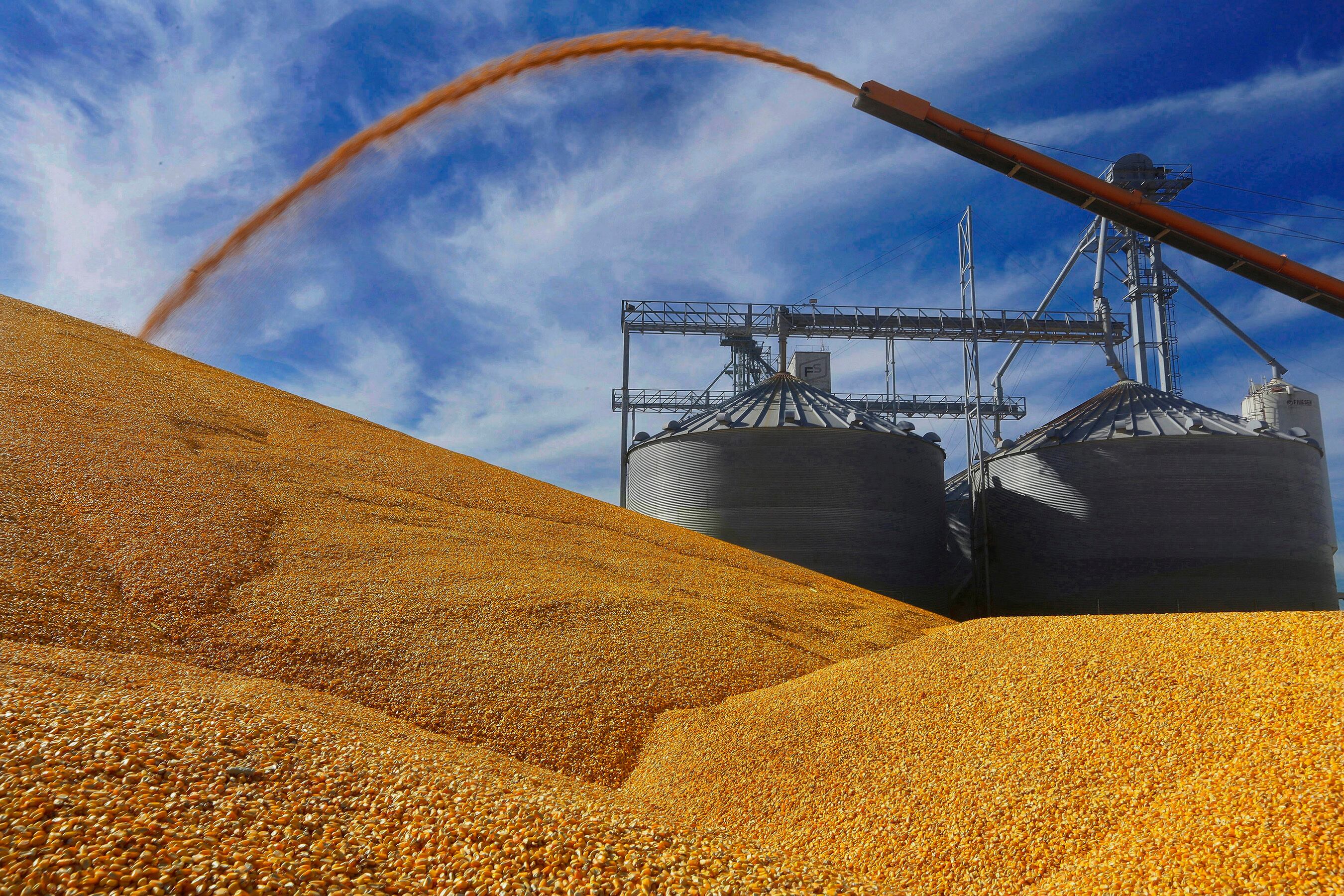 ARCHIVO - En esta fotografía del 23 de septiembre de 2015, agricultores de Illinois colocan maíz cosechado en el suelo fuera de un elevador de grano lleno en Virginia, Illinois. (AP Foto/Seth Perlman, Archivo) (Seth Perlman/AP)
