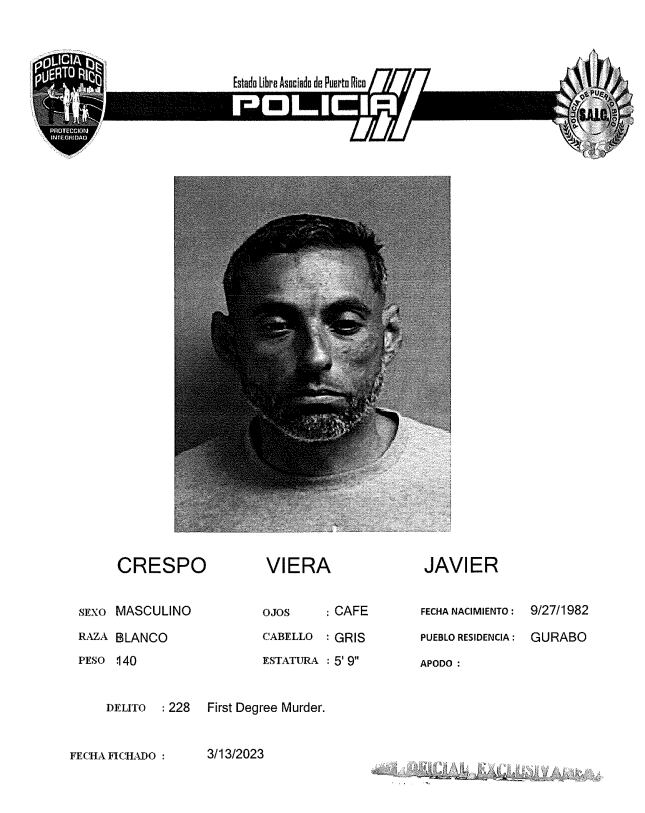 Agentes adscritos al Negociado de Arrestos e Inteligencia del área de Caguas, arrestaron a un hombre, identificado como Javier Crespo Viera, de 40 años y residente en Gurabo, contra quien pesaba una fianza de $1.2 millones por violaciones a los artículos 93A (Asesinato), 2.49 (Riesgo a la seguridad u orden público al disparar un arma de fuego) del Código Penal de Puerto Rico, 6.05 (Portación, Transportación o Uso de Armas de Fuego sin Licencia) y 6.14 (Disparar o apuntar armas de fuego) de la Ley de Armas, expedida por la juez Ingrid Caro del tribunal de Caguas.