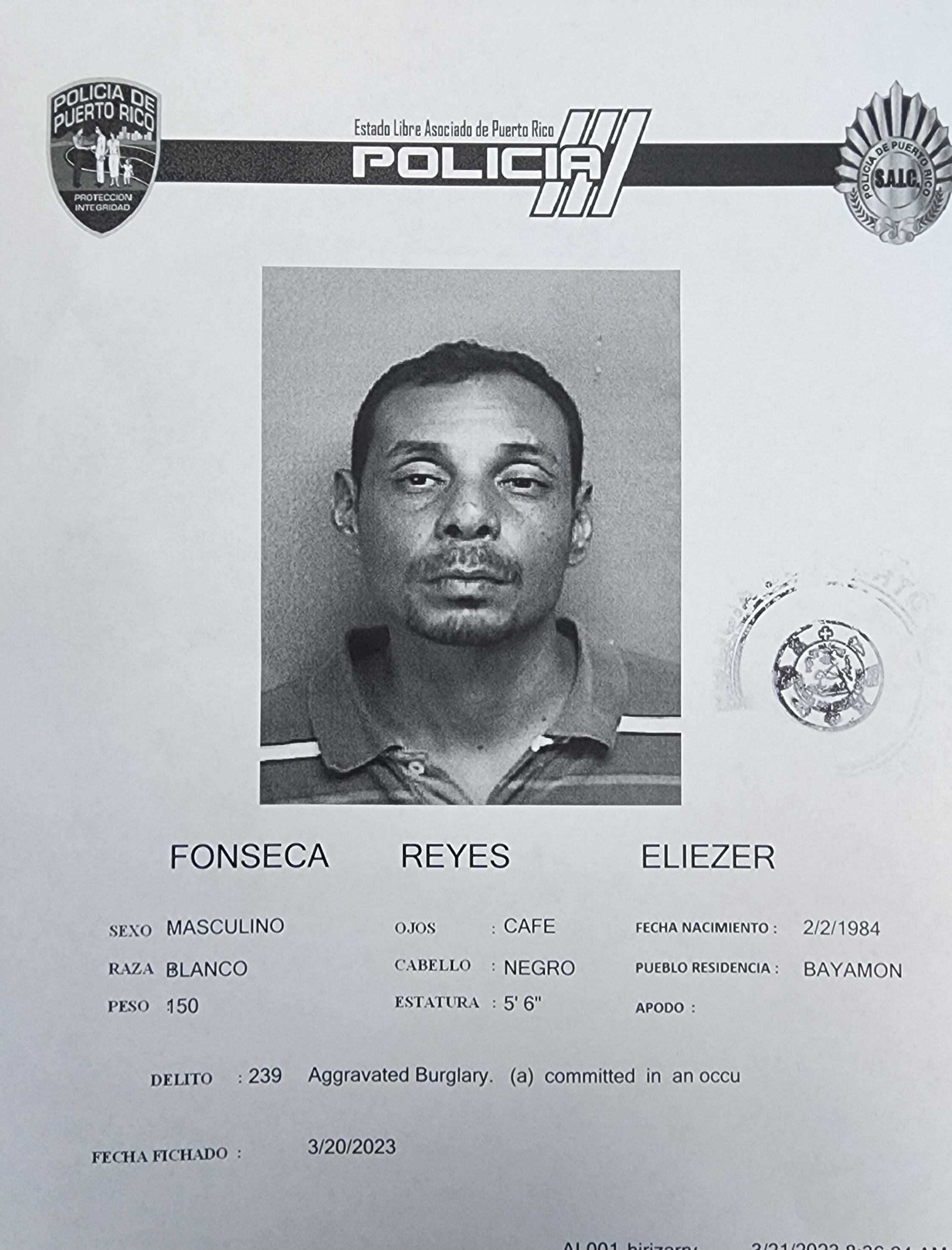 Según el reporte policial, Fonseca Reyes fue detenido luego de cometer escalamiento y apropiarse de propiedad valorada en más de $600, aproximadamente.