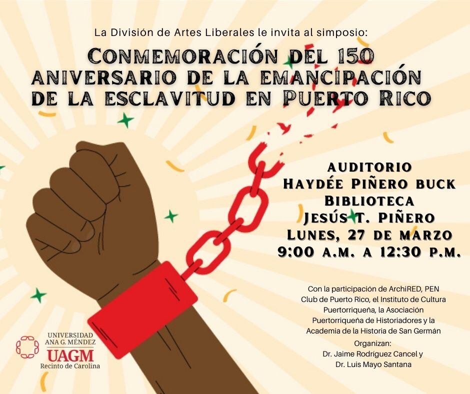 El Recinto de Carolina de la Universidad Ana G. Méndez (UAGM) será la sede para la celebración de un simposio sobre el 150 aniversario de la emancipación de la esclavitud. El evento se llevará a cabo el lunes, 27 de marzo de 9:00 a.m. a 12:30 p.m. en la Biblioteca y Centro de Investigación Jesús T. Piñero.