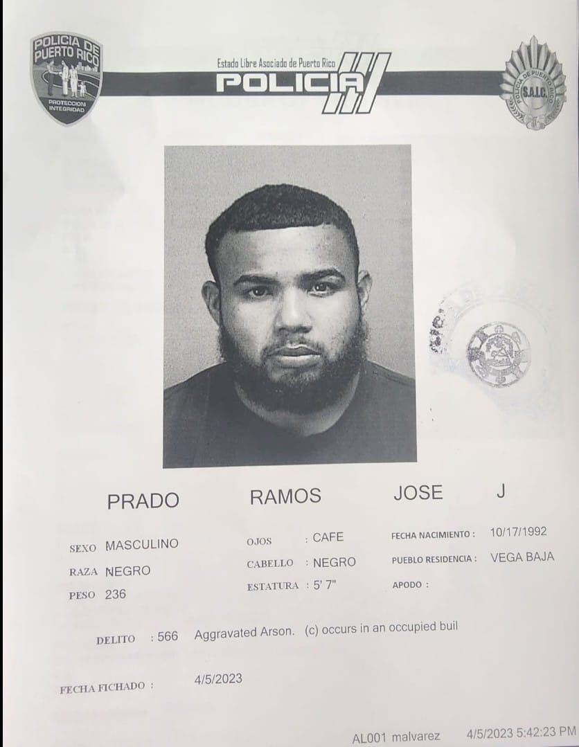 Agentes del Negociado de la Policía de Puerto Rico, adscritos a la División de Explosivos Metro, realizaron una investigación que culminó en la radicación de cargos por Incendio Malicioso Agravado en un edificio ocupado o perteneciente al Estado Libre Asociado de Puerto Rico (Art. 231(c) del Código Penal) por parte de Fiscalía, contra José Javier Prado Ramos, de 30 años y vecino de Vega Baja.