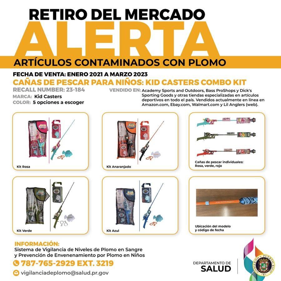 En un comunicado de prensa, la Kid Caster reveló que se descubrió que la guía de cerámica en la punta de la caña contenía cantidades tóxicas y peligrosas si se ingieren. Las cañas de pescar retiradas vienen en color azul, verde, naranja, rosa y rojo.