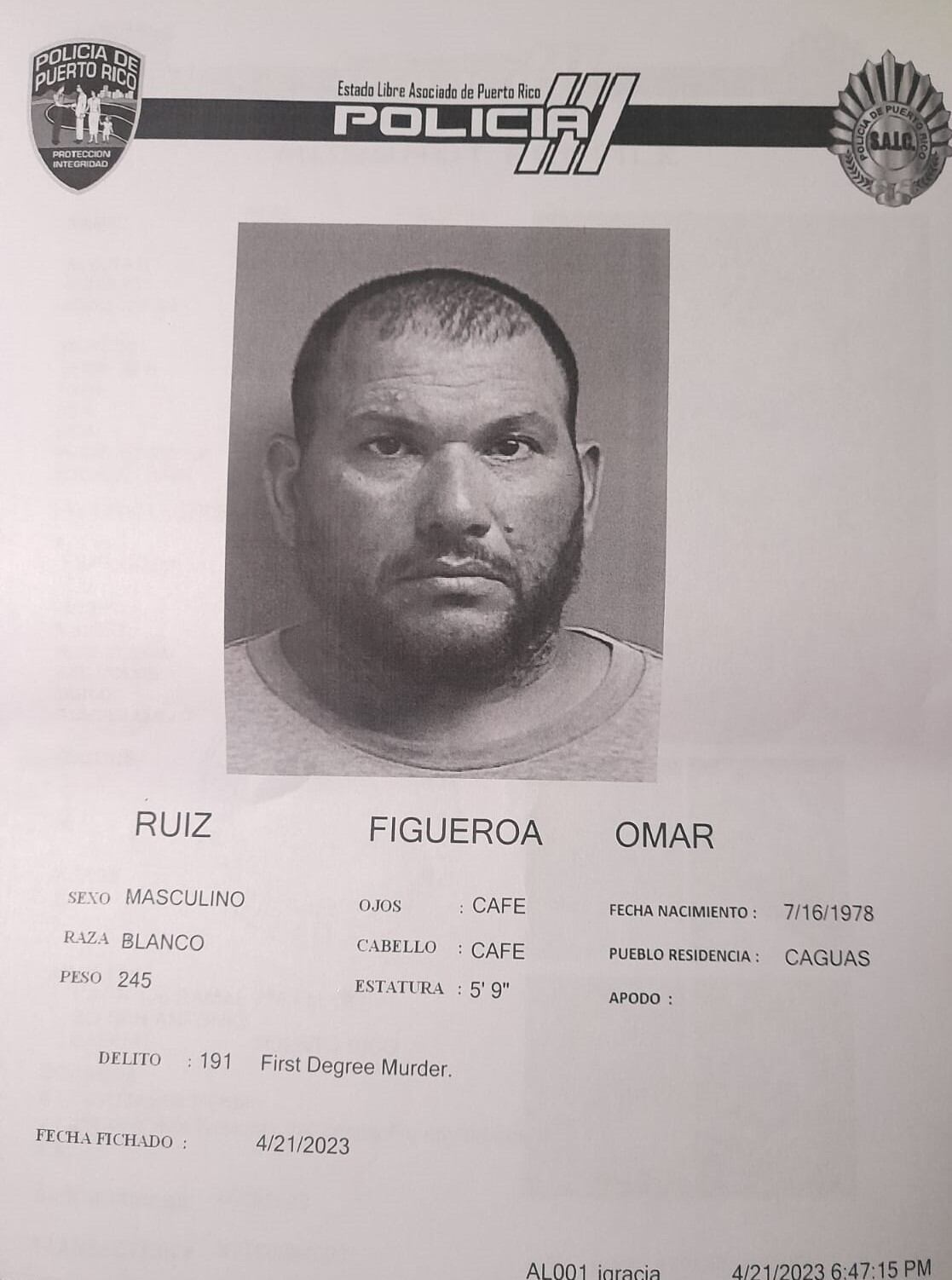 Según el reporte de la Policía, Omar Osvaldo Ruiz Figueroa, de 44 años y vecino de Caguas supuestamente disparó y le causó la muerte a Eggy Galarza Estrada, de 51 años, en la carretera PR-175, sector Las Carmelitas del barrio San Antonio, en ese municipio.