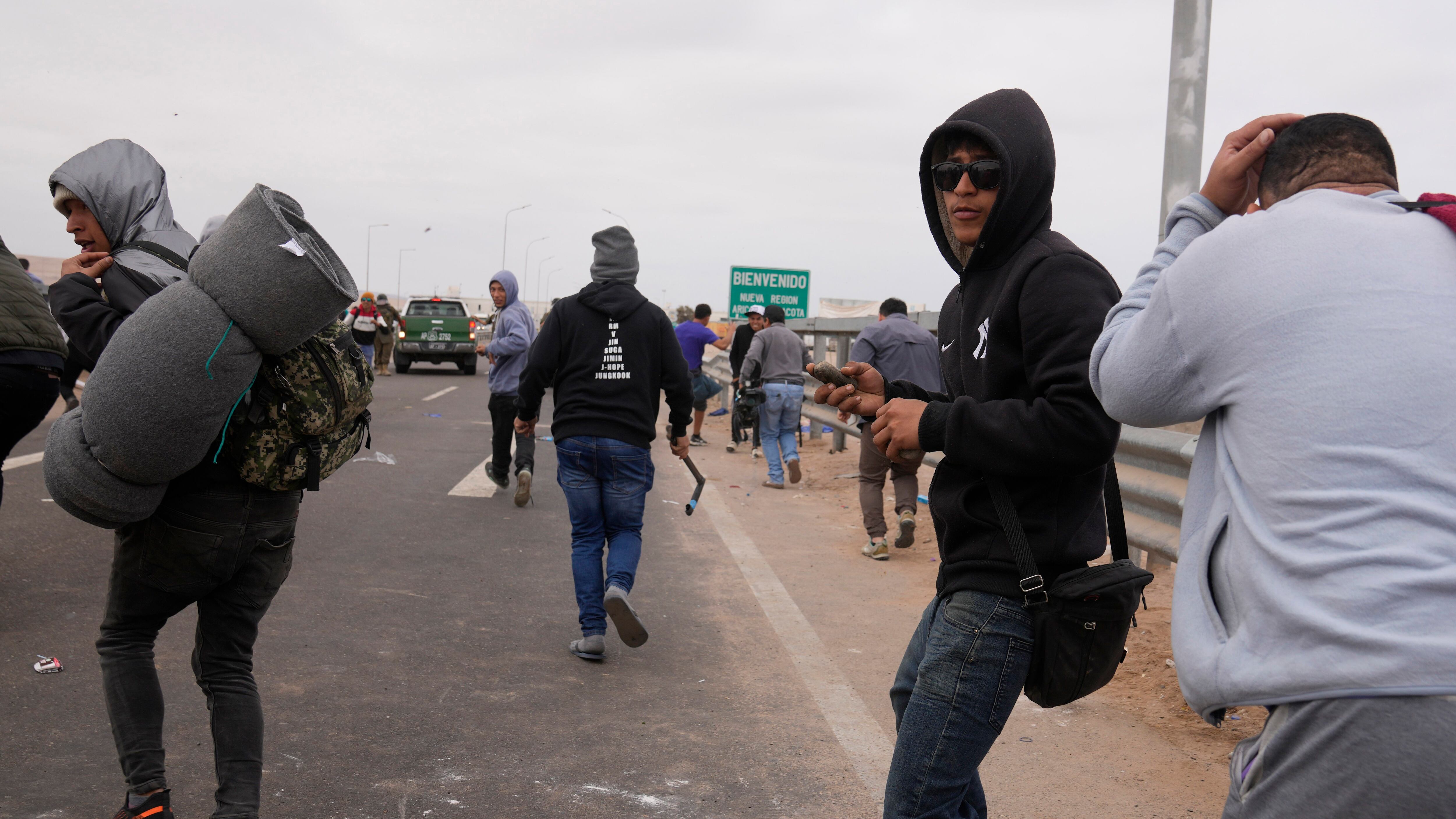 El periodista Pablo Abarza, que se encuentra en la zona limítrofe entre los dos países, informó que un grupo de ciudadanos peruanos que esperaban en una larga fila para ingresar a Chile se pelearon con migrantes venezolanos que bloquearon la ruta. El noticiero capturó imágenes en las que se veía el lanzamiento de piedras entre ambos lados de la frontera.
