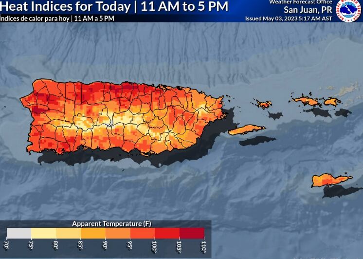 “Índices de calor posiblemente alcanzando alrededor de 102° hasta 107° en general a través de bajas elevaciones del norte y oeste de Puerto Rico”, indicó el NWS a través de su cuenta de Twitter.