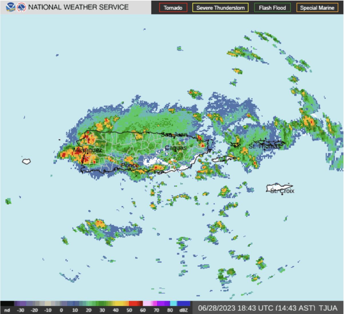 Según el SNM, un fuerte aguacero con la capacidad de producir trombas marinas se localizó sobre las aguas costeras occidentales de Puerto Rico, justo al oeste de Mayagüez, desplazándose hacia el oeste a 10 nudos.