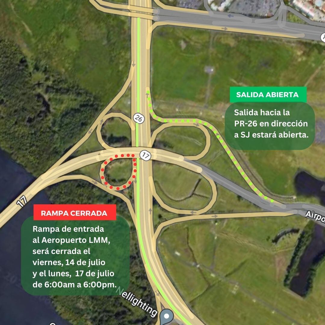 Finalizadas las labores de repavimentación ayer, jueves, en la rampa de salida del aeropuerto, según programado, se procederá a abrir la misma y mañana viernes, 14 de julio comenzarán los trabajos en la rampa de entrada al aeropuerto en dirección de San Juan a Carolina. Estos trabajos comienzan mañana a partir de las 6:00 a.m. hasta las 6:00 p.m. y continúan el lunes 17 de julio en el mismo horario.