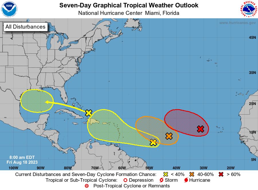 Además, el Centro Nacional de Huracanes también se mantiene vigilando otras tres Ondas Tropicales que se encuentran en el Océano Atlántico. Una de estas con 70% de potencial ciclónico se encuentra al oeste de las islas de Cabo Verde. Otra con 40% de potencial ciclónico más cerca de las Antillas Menores y el sistema de 30% al este-sureste de las Antillas Menores que podría traer lluvia a Puerto Rico.