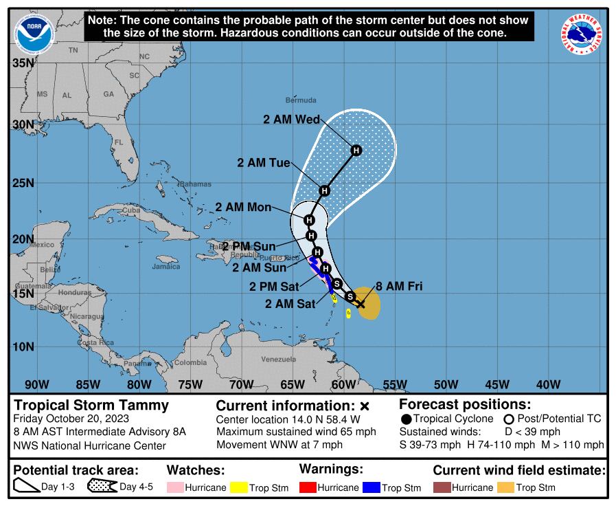El sistema se encontraba a unas 90 millas al noreste de Barbados y a unas 170 millas al este-sureste de Martinica. Tammy se desplaza en dirección oeste-noroeste a una velocidad de 7 millas por hora.