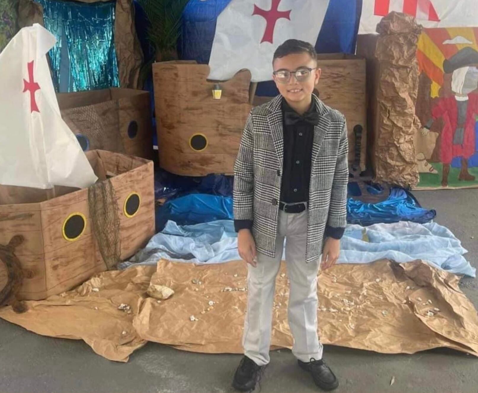Un niño del pueblo de Arecibo se vistió como el productor y moderador de Jugando Pelota Dura, Ferdinand Perez, como parte de la celebración del día de la puertorriqueñidad.