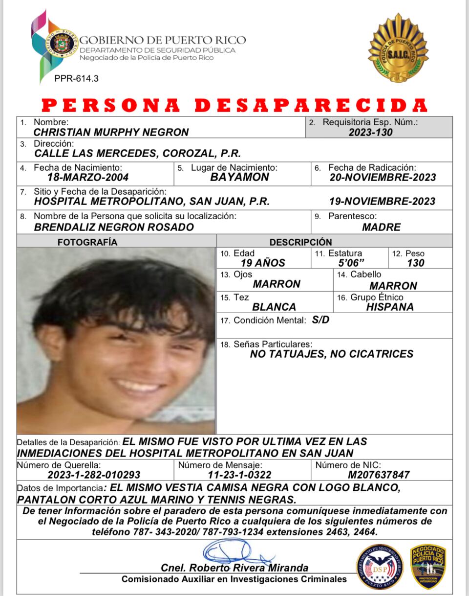 Murphy Negrón había sido reportado desaparecido ayer, 20 de noviembre, por su madre, Brendaliz Negrón Rosado, tras ser visto por última vez el domingo, 19 de noviembre, en el hospital Metropolitano, en San Juan. Dicho reporte, originó una investigación por agentes del CIC de San Juan.
