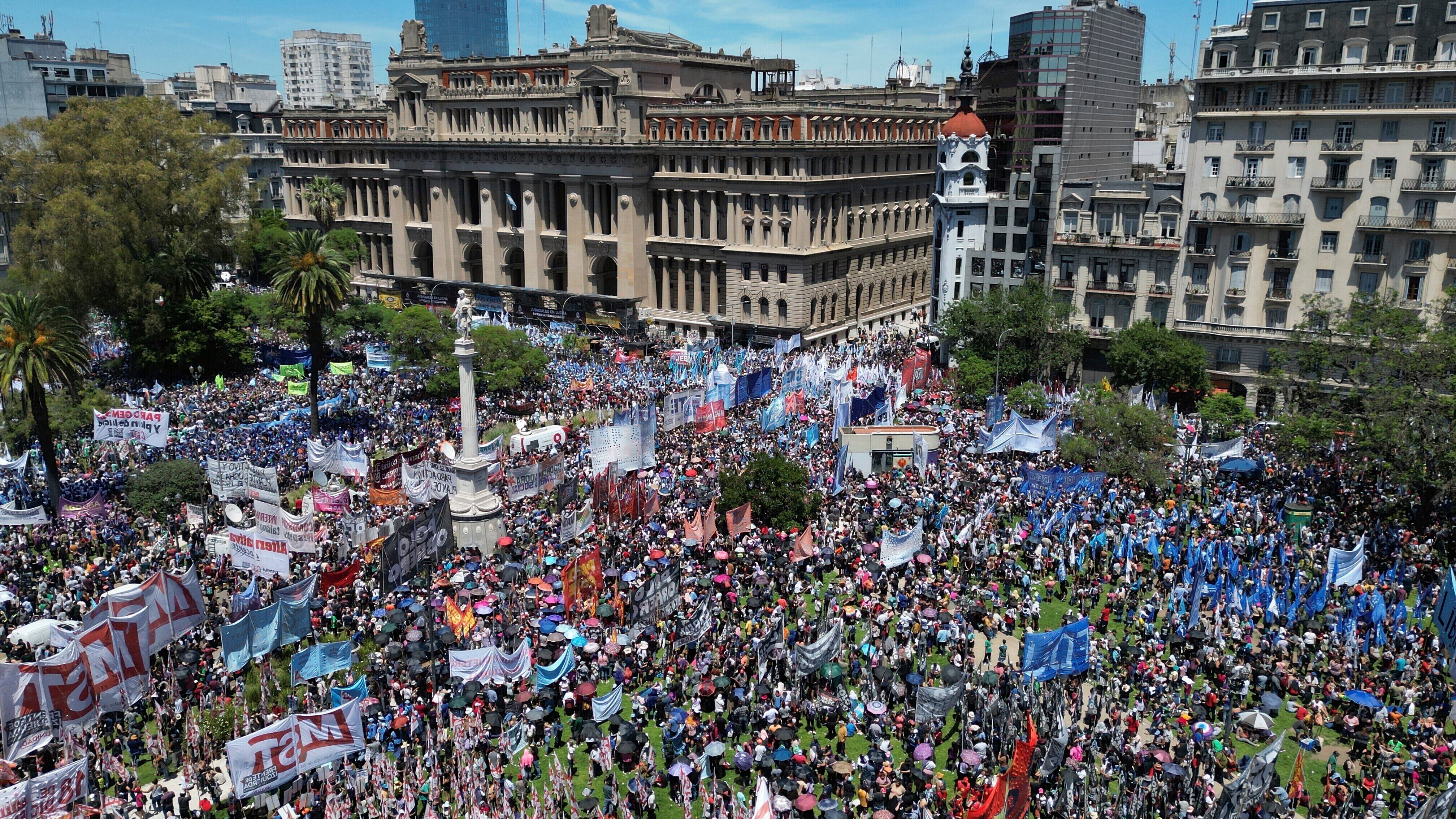 “La patria no se vende” era uno de los cánticos de los manifestantes concentrados en la plaza situada frente al Palacio de Justicia —sede del Poder Judicial y la Corte Suprema— en contra del paquete de reformas anunciado la semana pasada por el mandatario, un economista neoliberal que ha prometido drásticas reformas para enderezar la economía y atajar la inflación que se encamina a una tasa de 200% a fin de año.