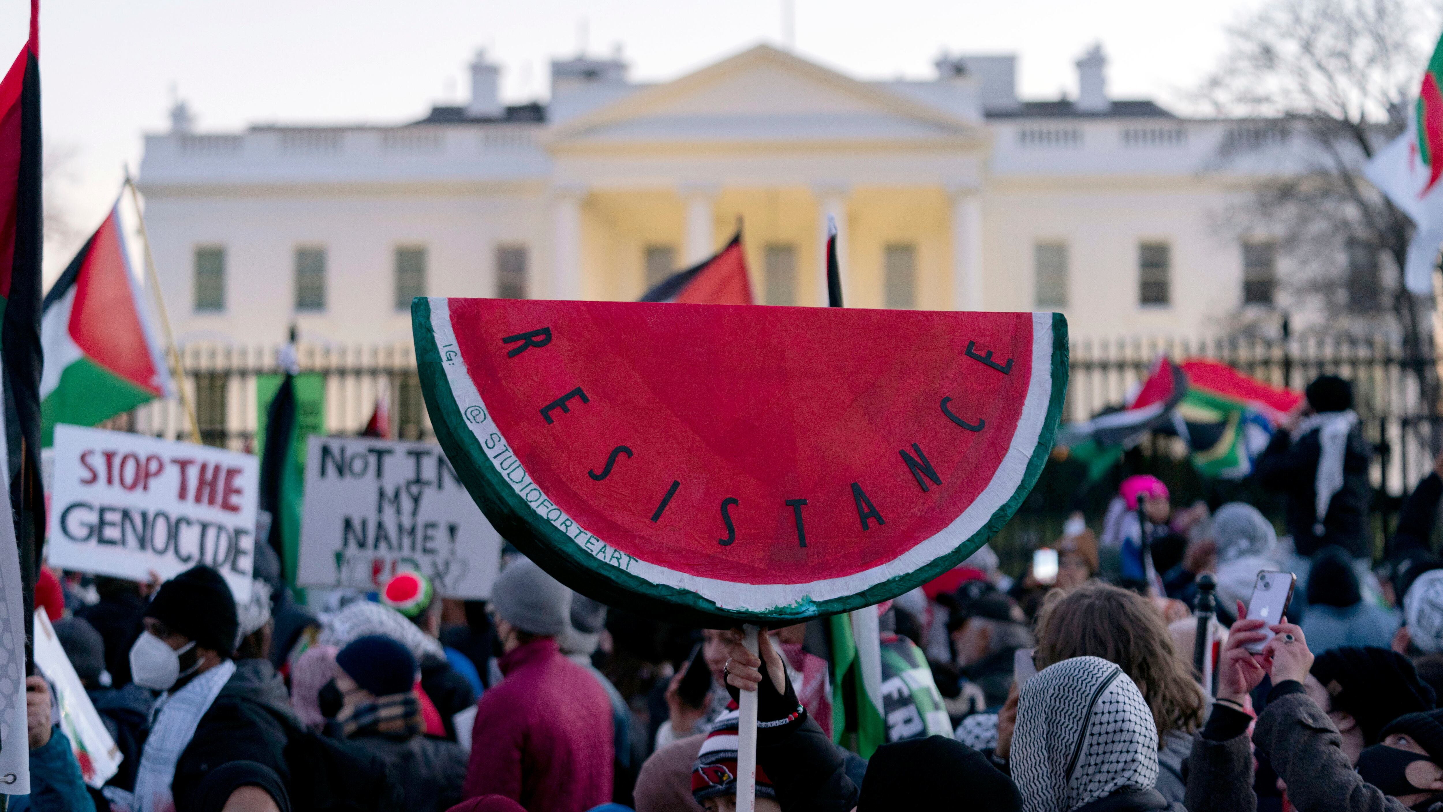 En la capital de Estados Unidos, los manifestantes alzaban carteles en los que se cuestionaban la viabilidad del presidente Joe Biden como candidato presidencial por su apoyo incondicional a Israel en la guerra de casi 100 días contra Hamás. Algunos de los carteles decían: “Ningún voto para el genocida Joe”, “Biden tiene las manos manchadas de sangre” y " Dejen vivir a Gaza”.