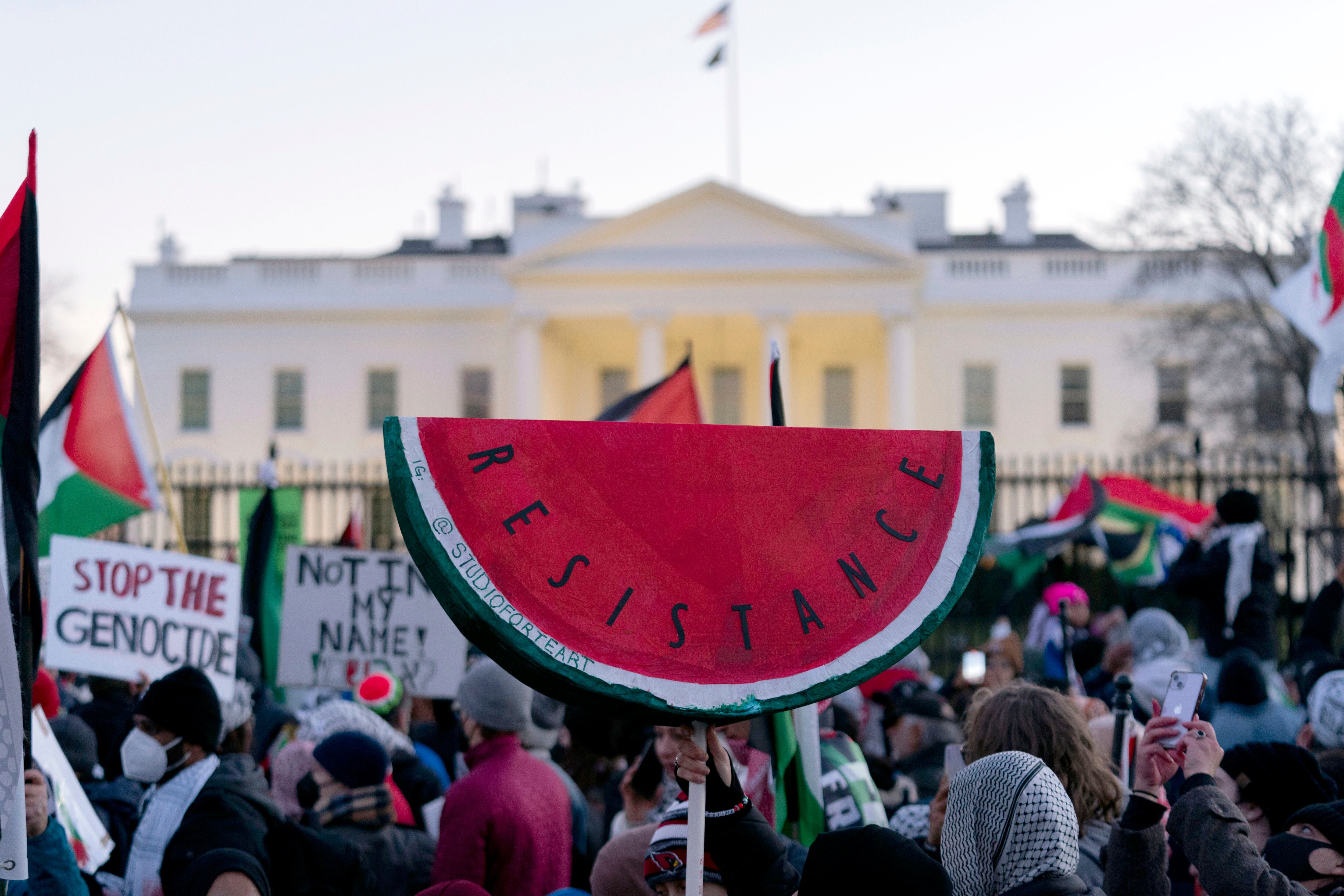 En la capital de Estados Unidos, los manifestantes alzaban carteles en los que se cuestionaban la viabilidad del presidente Joe Biden como candidato presidencial por su apoyo incondicional a Israel en la guerra de casi 100 días contra Hamás. Algunos de los carteles decían: “Ningún voto para el genocida Joe”, “Biden tiene las manos manchadas de sangre” y " Dejen vivir a Gaza”.