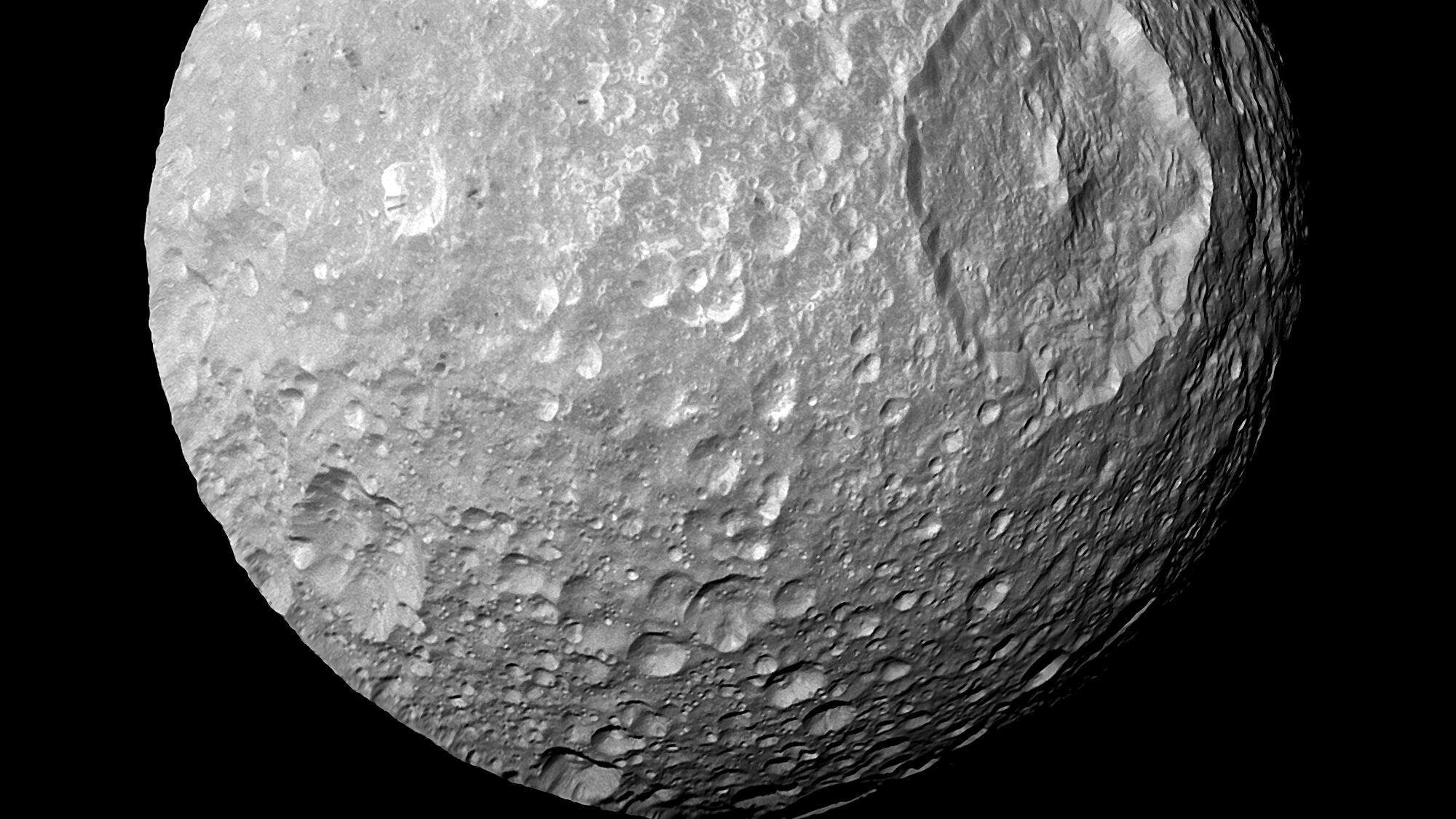 Se cree que el océano llena la mitad del volumen de Mimas, según Lainey. Sin embargo, apenas representa del 1,2% al 1,4% de los océanos de la Tierra dado el pequeño tamaño de la luna. Pese a ser tan pequeña, Mimas cuenta con el segundo cráter de impacto más grande de cualquier luna en el sistema solar, razón por la cual se compara con la estación espacial ficticia de la Estrella de la Muerte de la saga “Star Wars”.