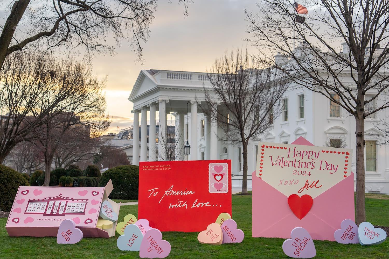El detalle de San Valentín también lo acompaña con un sobre rosa y una tarjeta con el mensaje “¡Feliz San Valentín! XOXO, Jill”. Todo se instaló durante la noche del martes en el césped del lado de la Casa Blanca de la Avenida Pensilvania.