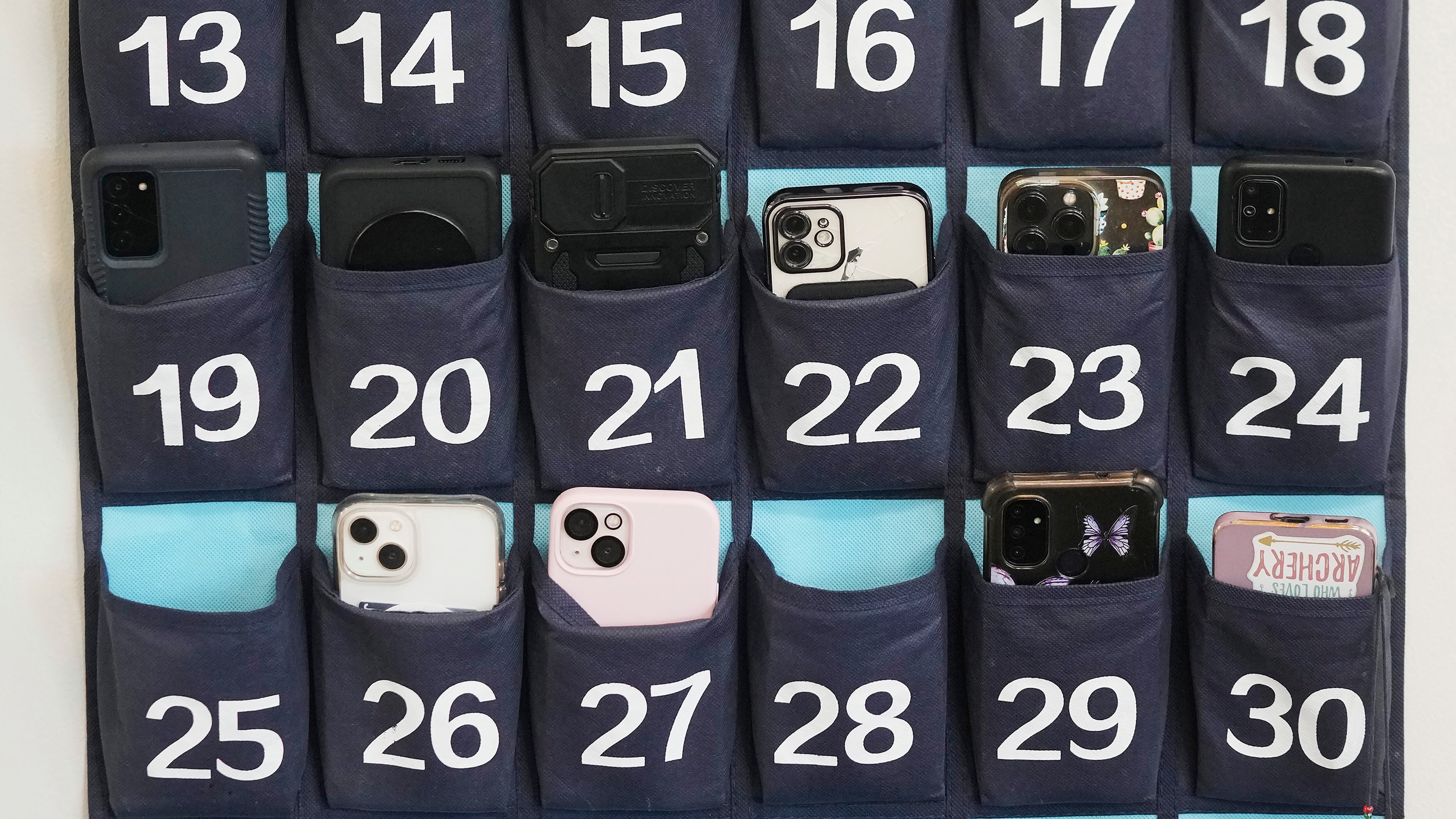 En la Escuela Secundaria Delta, en una zona rural de Utah donde Jaden es estudiante de primer año, los alumnos deben guardar sus teléfonos en la puerta al ingresar a cada clase. Cada una de las aproximadamente 30 aulas de la escuela tiene una unidad de almacenamiento para teléfonos que parece una bolsa de zapatos colocada en la puerta con tres docenas de compartimientos del tamaño de un celular.