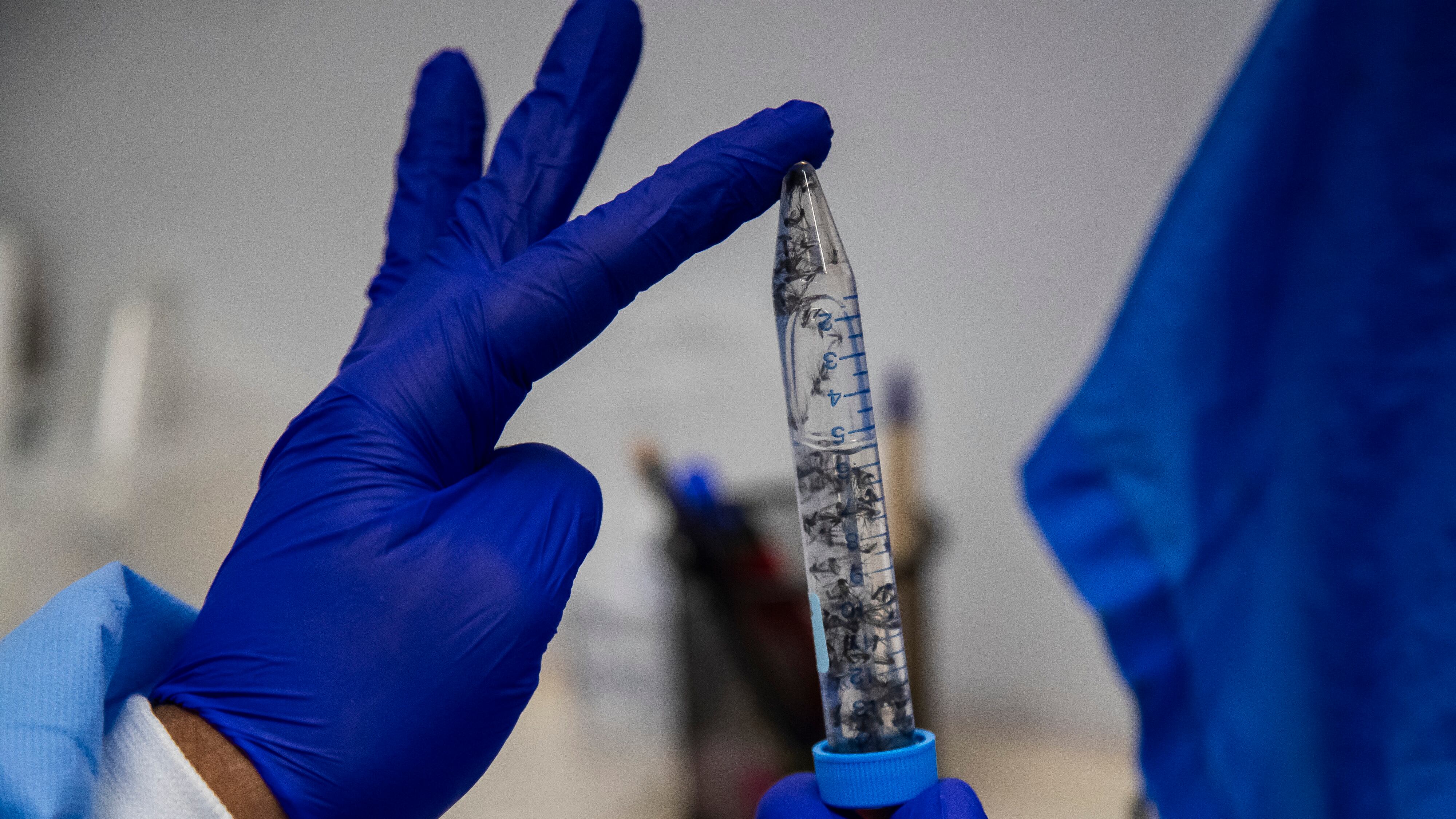 Un técnico de laboratorio analiza mosquitos que fueron recolectados de zonas al aire libre donde se liberaron mosquitos que llevan la bacteria Wolbachia que bloquea el virus del dengue, en Río de Janeiro, Brasil, el martes 27 de febrero de 2024. (AP Fot AP (Bruna Prado/AP)