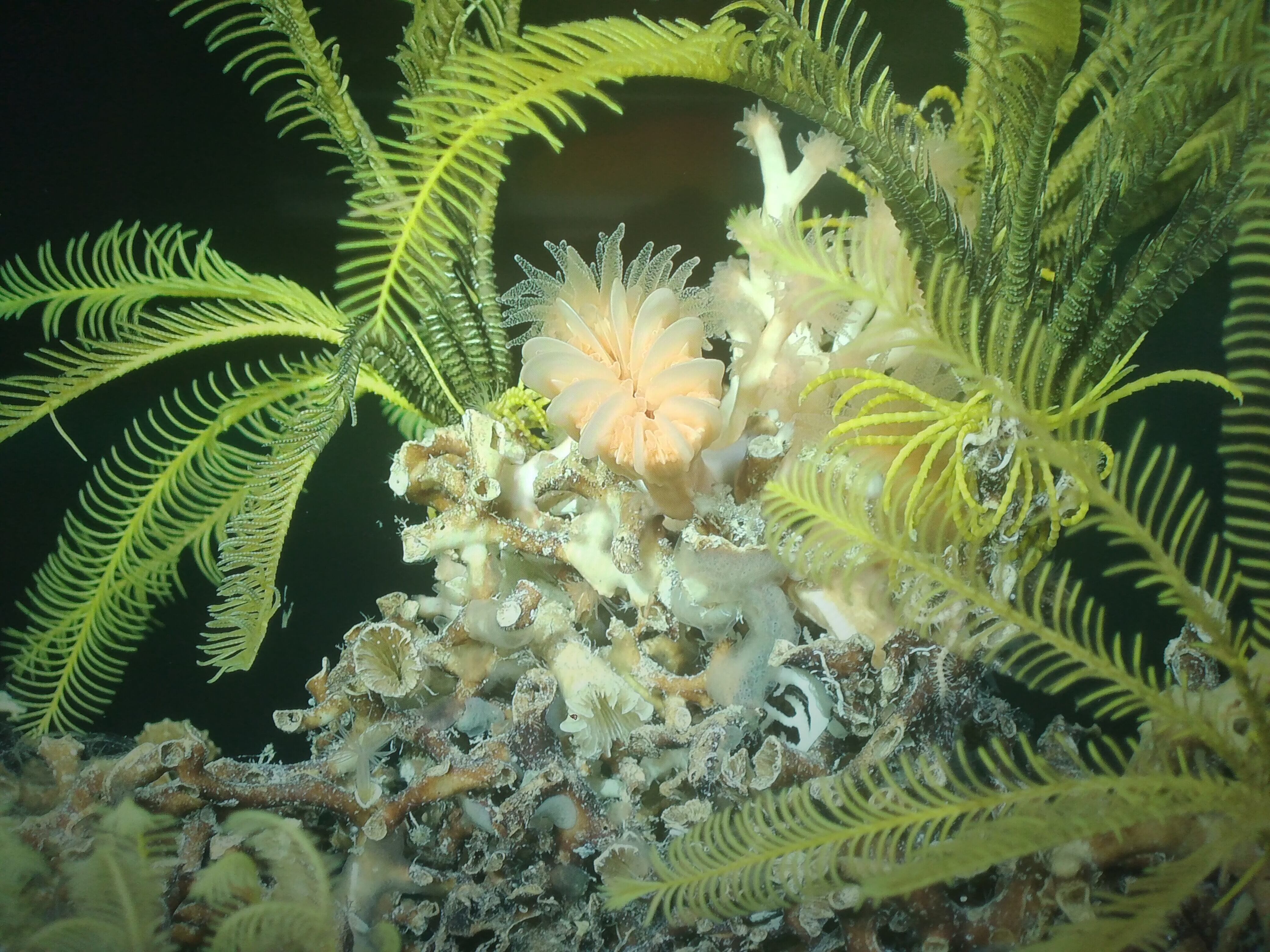 –El objetivo principal de la expedición se centró en la exploración de ecosistemas asociados al fondo marino (ambiente bentónico), por lo tanto, los organismos que mayormente se benefician de estos ecosistemas son aquellos que viven asociados a los corales y esponjas. Así encontramos principalmente muchos erizos, estrellas frágiles (ofiuros), crinoídeos, camarones, poliquetos, caracoles, anfípodos, peces y otros invertebrados que viven gracias a la presencia de corales y esponjas.