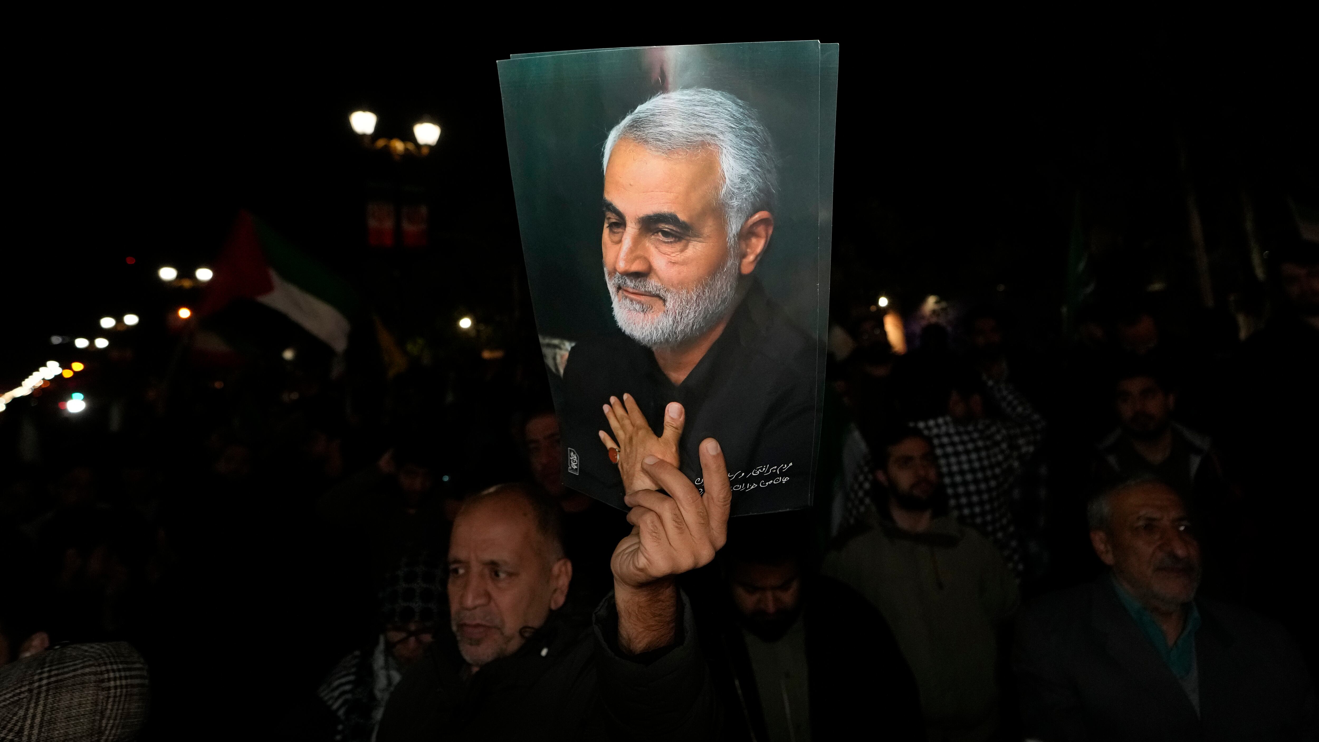 Un manifestante sostiene un cartel del fallecido general de la Guardia Revolucionaria iraní Qassem Soleimani, asesinado en un ataque de dron estadounidense en 2020 en Irak, en un acto contra Israel ante la embajada británica en Teherán, Irán, la madru AP (Vahid Salemi/AP)