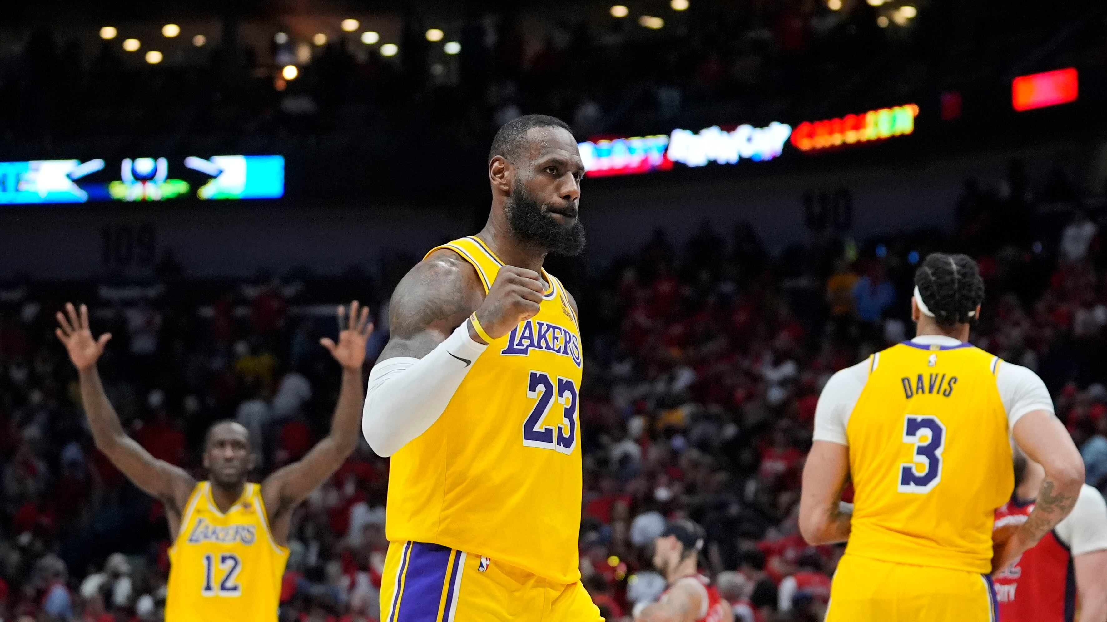 James totalizó 23 puntos, nueve asistencias y nueve rebotes, y Los Ángeles aseguró un boleto para los playoffs, al imponerse el martes 110-106 a Nueva Orleáns el martes, en el minitorneo de repesca.