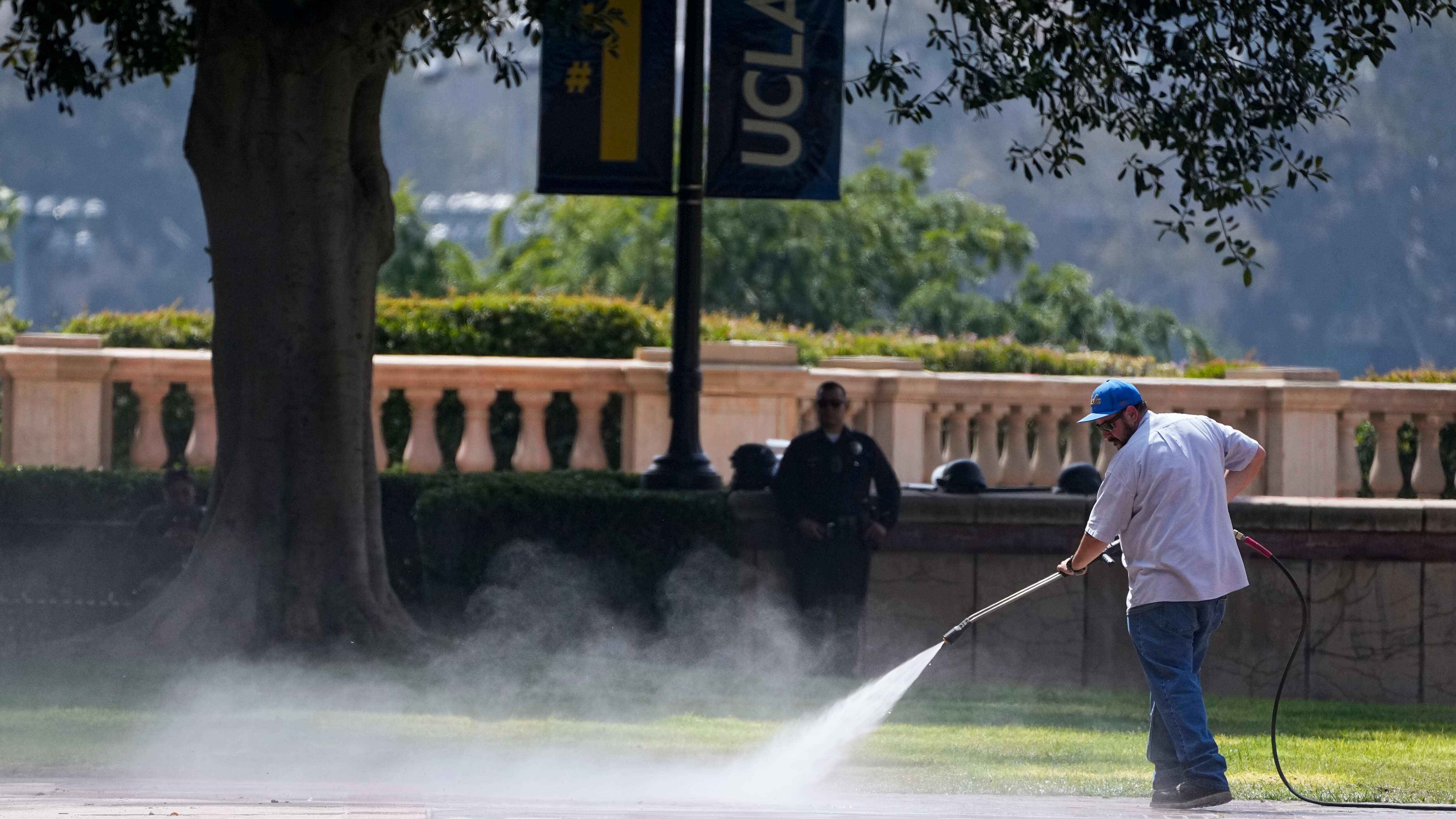 A primera hora del jueves, los agentes se abalanzaron contra una multitud de manifestantes en la Universidad de California, en Los Ángeles, y arrestaron a unos 200 después de que cientos de ellos desafiaran las órdenes de marcharse, algunos formando cadenas humanas mientras la policía disparaba granadas de estruendo para disolver a la multitud. La policía derribó una barricada fortificada con madera contrachapada, plataformas, vallas metálicas y contenedores de basura, y derribó toldos y tiendas de campaña.