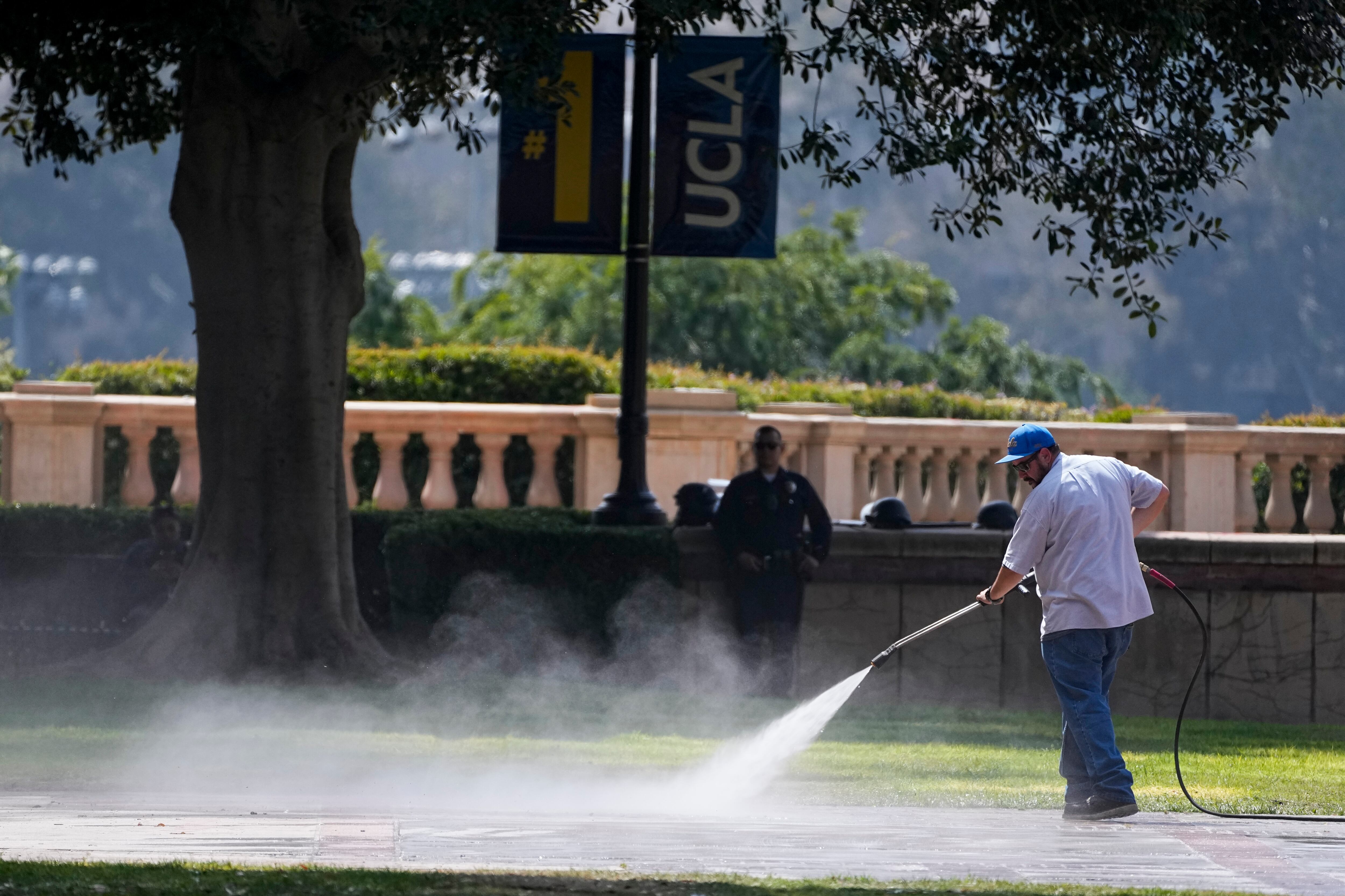 A primera hora del jueves, los agentes se abalanzaron contra una multitud de manifestantes en la Universidad de California, en Los Ángeles, y arrestaron a unos 200 después de que cientos de ellos desafiaran las órdenes de marcharse, algunos formando cadenas humanas mientras la policía disparaba granadas de estruendo para disolver a la multitud. La policía derribó una barricada fortificada con madera contrachapada, plataformas, vallas metálicas y contenedores de basura, y derribó toldos y tiendas de campaña.