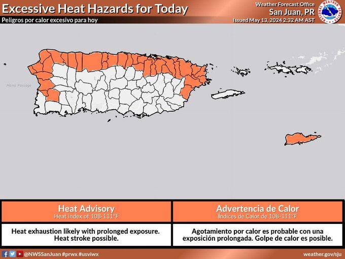 [ May 13 ] With warmer-than-normal temperatures in a high moisture environment, heat indices will likely reach 108-111ºF across portions of western, northern, and eastern PR and St Croix today, where Heat Advisories are in effect. #PRwx #USVIwx pic.twitter.com/aQGe0p7y4W