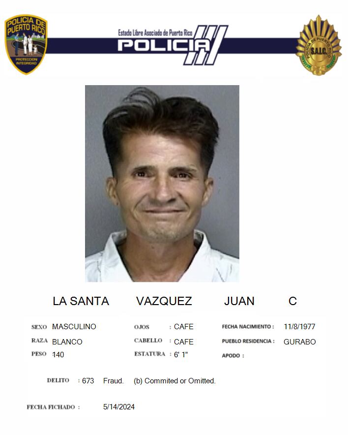 La Policía informó el martes que la División Robo a Bancos y Fraude a Instituciones Bancarias, Financieras y Cooperativas, junto con el fiscal Luis Castro Rossó de la fiscalía de San Juan, radicaron cargos contra Juan Carlos La Santa Vázquez, de 46 años y residente de Gurabo.