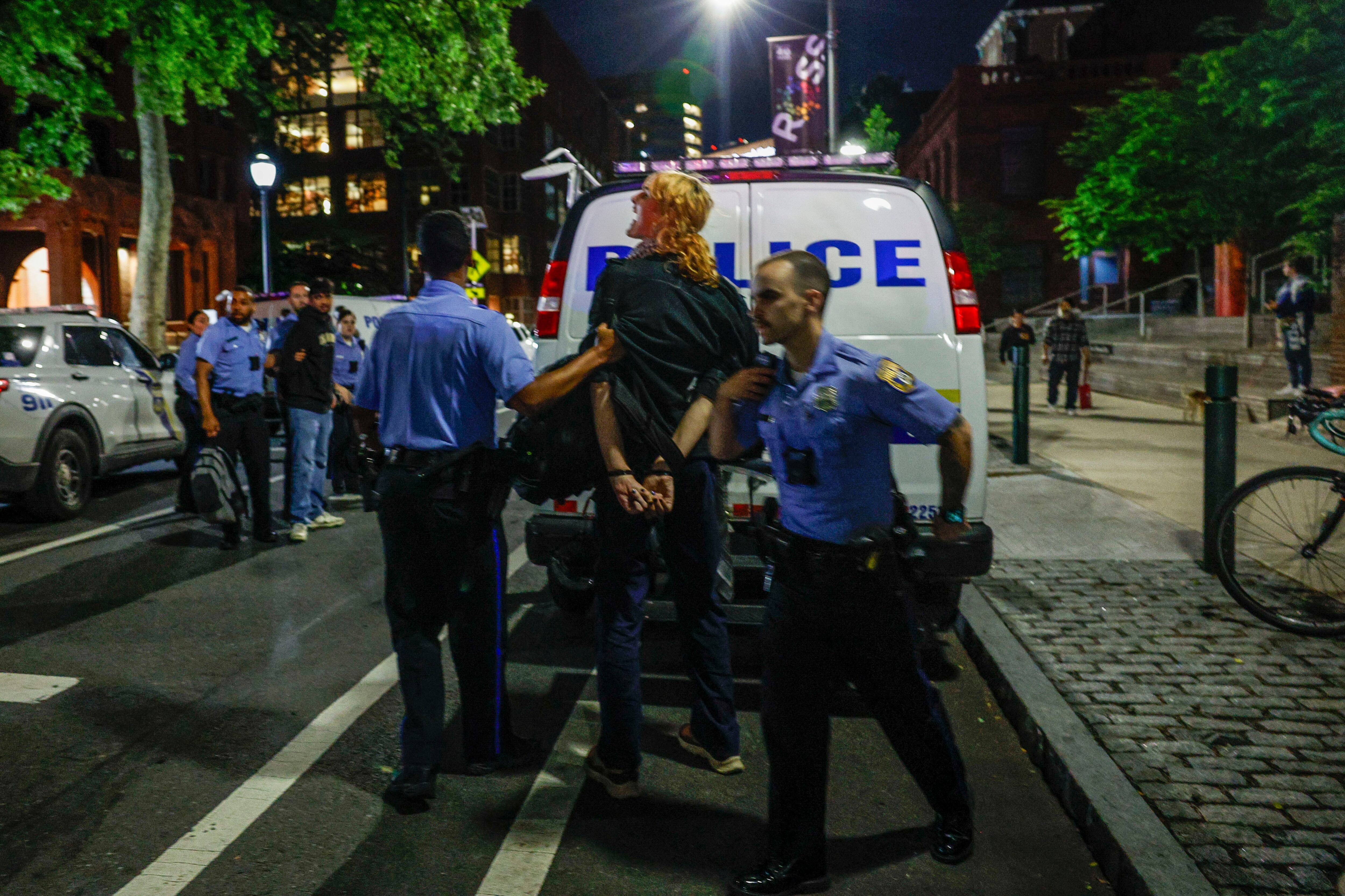 Un manifestante es arrestado en la calle S 34, cerca de la Universidad de Pensilvania, el viernes 17 de mayo de 2024, en Filadelfia. (Steven M. Falk/The Philadelphia Inquirer vía AP) AP (Steven M. Falk/AP)