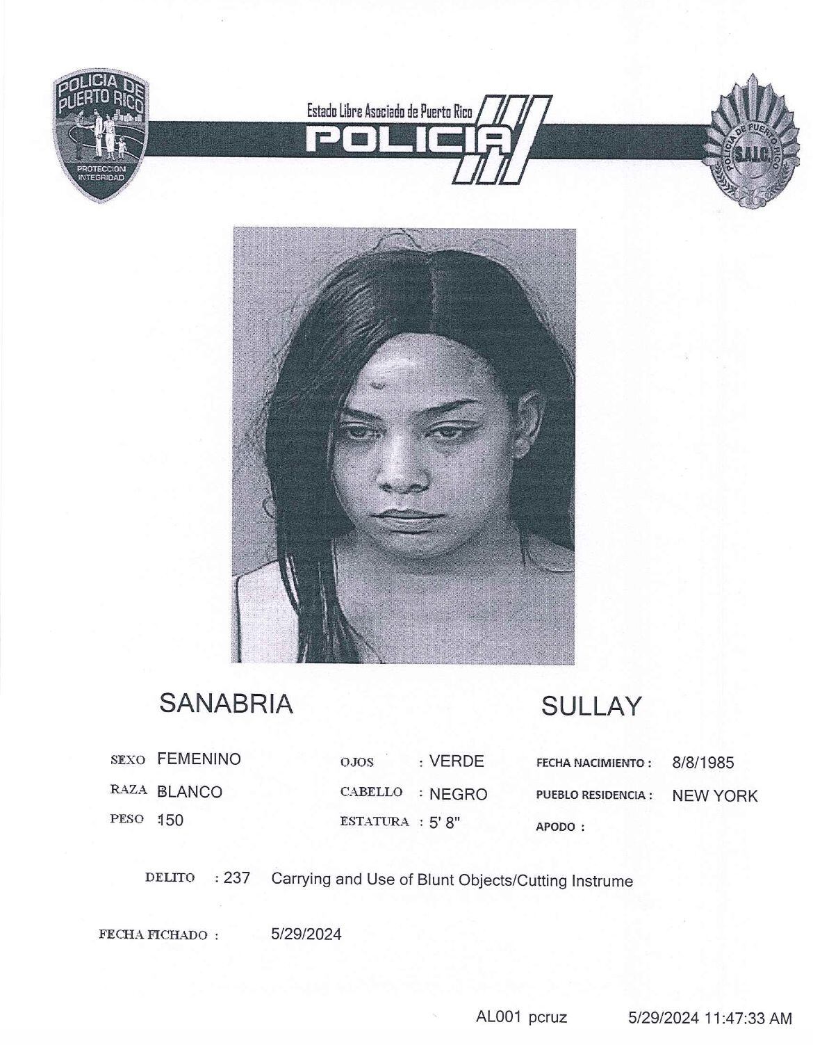 Las autoridades presentaron cargos contra una mujer, identificada como Sullay Sanabria Paz, de 38 años y residente de Mayagüez, por los delitos de Robo, Ley de Armas y Maltrato de Envejeciente.