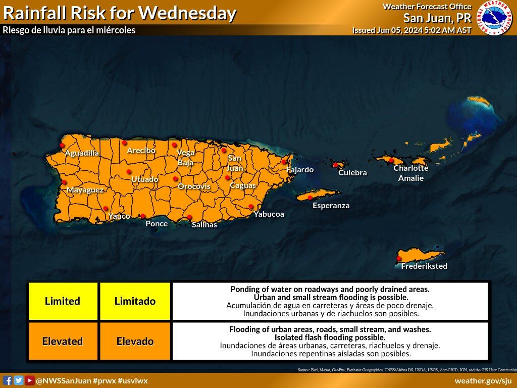 🌦️The rainfall risk is elevated across Puerto Rico, Vieques, Culebra & the U.S. Virgin Islands, today.