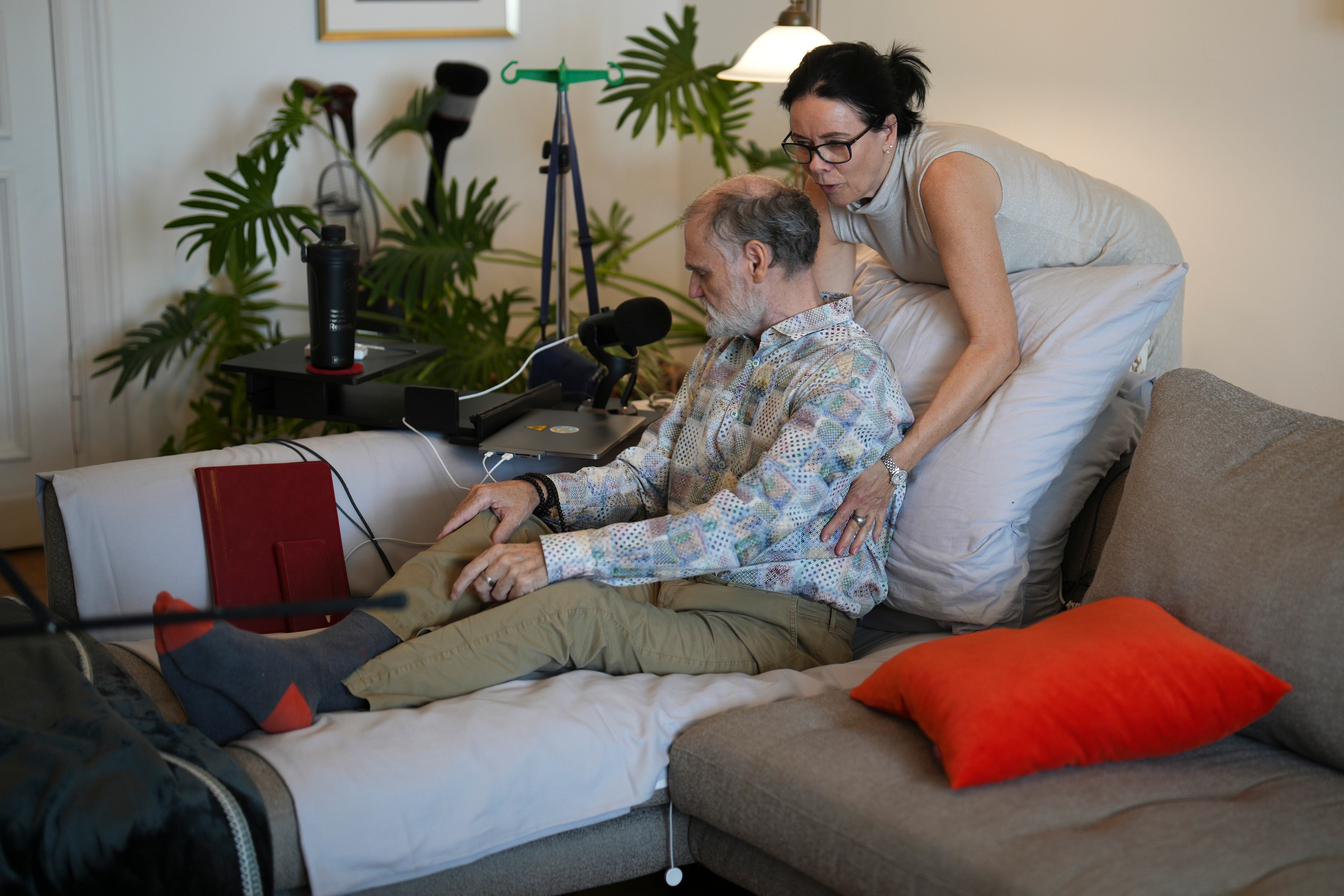 Sentado en un sofá con una tableta y un micrófono conectado a una computadora portátil en un pequeño escritorio junto a él y recibiendo analgésicos por goteo intravenoso, Bommer abrió el software recién creado y fingió ser su esposa, para mostrar cómo funciona.