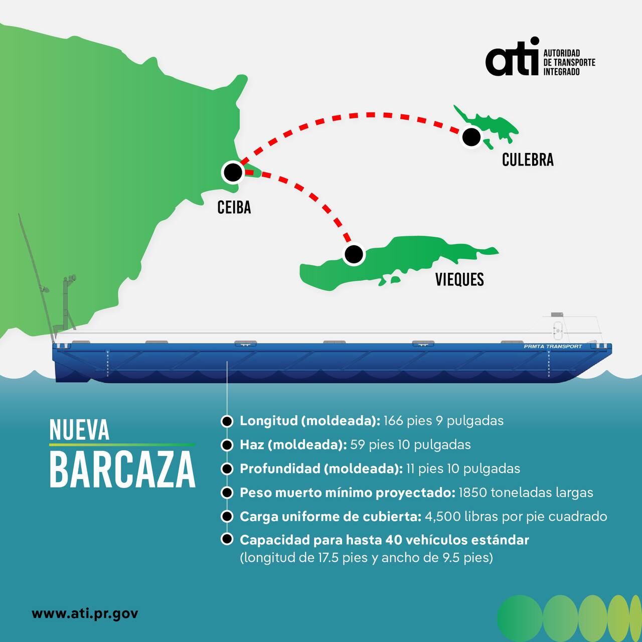 En un paso estratégico para optimizar el transporte de carga y los servicios que reciben las islas municipios de Vieques y Culebra, la Autoridad de Transporte Integrado (ATI) adjudicó un nuevo contrato para la construcción de una barcaza que fortalecerá la red de transporte y carga marítima, informó la secretaria del Departamento de Transportación y Obras Públicas (DTOP), la ingeniera Eileen M. Vélez Vega, y el director ejecutivo de ATI, Josué Menéndez Agosto.