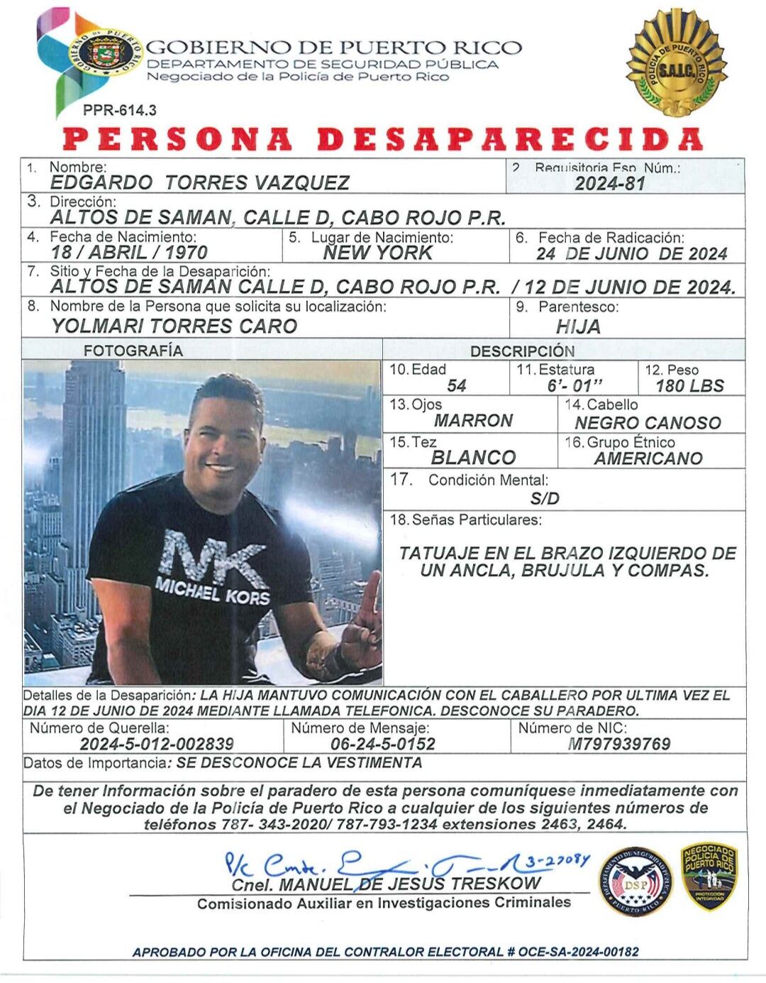 La División de Propiedad, Robo y Personas Desaparecida del Cuerpo de Investigaciones Criminales del Área de Mayagüez del Negociado de la Policía de Puerto Rico, solicitó la ayuda de la ciudadanía para dar con el paradero de un hombre, identificado como Edgardo Torres Vázquez, de 54 años, reportado como desaparecido por su hija durante la tarde del martes, 18 de junio de 2024, en el pueblo de Cabo Rojo.
