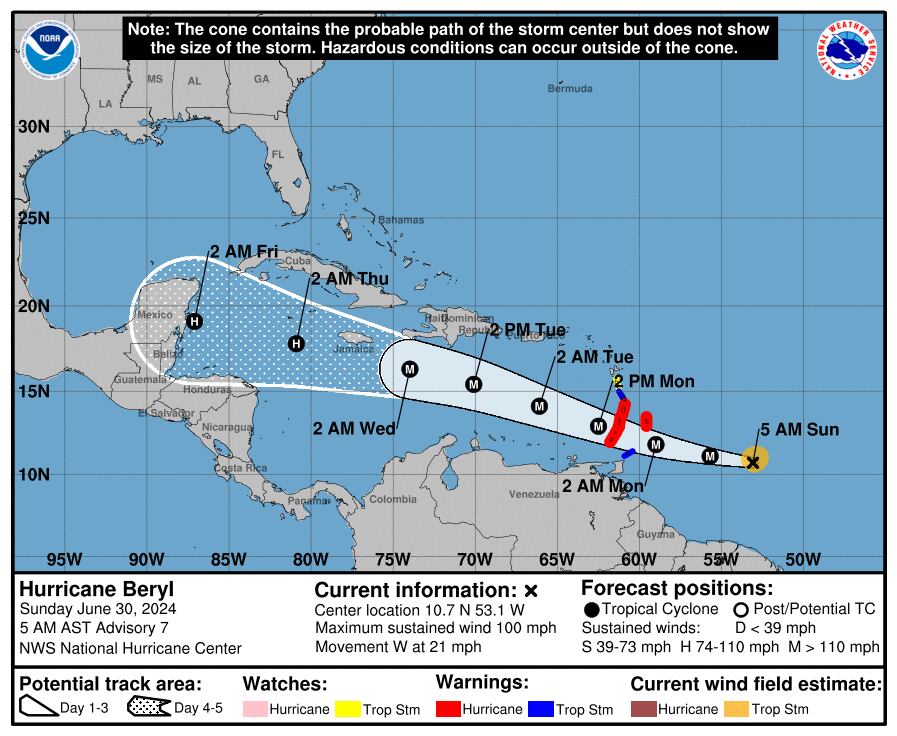 “Se espera que Beryl sea un huracán categoría 4 extremadamente peligroso cuando alcance las Islas de Barlovento el lunes temprano, trayendo vientos destructivos con fuerza de huracán y marejada ciclónica que amenaza la vida”, lee el reporte del SNM.