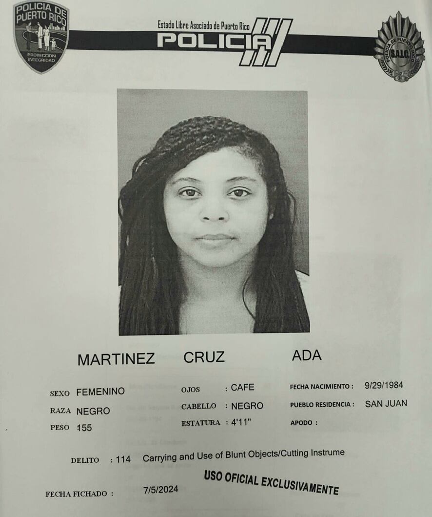 Agentes del Negociado de la Policía de Puerto Rico, adscritos a la División de Inteligencia y Arrestos Especiales de Bayamón, diligenciaron ayer en la tarde una orden de arresto expedida por la juez Aida Meléndez Juarbe del Tribunal de Bayamón, por violación a la Ley de Armas, contra Ada Martínez Cruz de 39 años.