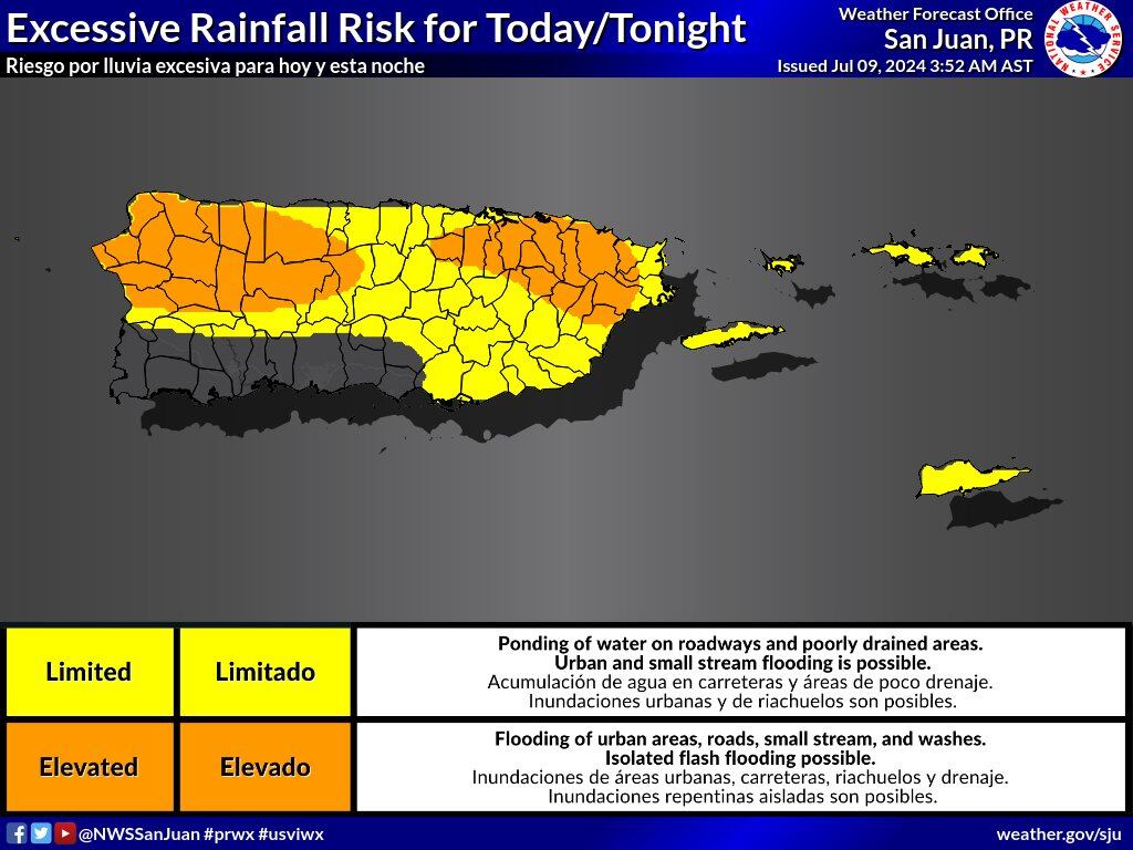 [ Jul 9 ] Despite the potential for Showers/T-Storms increasing the risk of excessive rainfall, warmer conditions will prevail. Heat Advisories are in effect. It is crucial for both visitors and residents to take necessary precautions. #PRwx #USVIwx pic.twitter.com/xWhBu5ZQak
