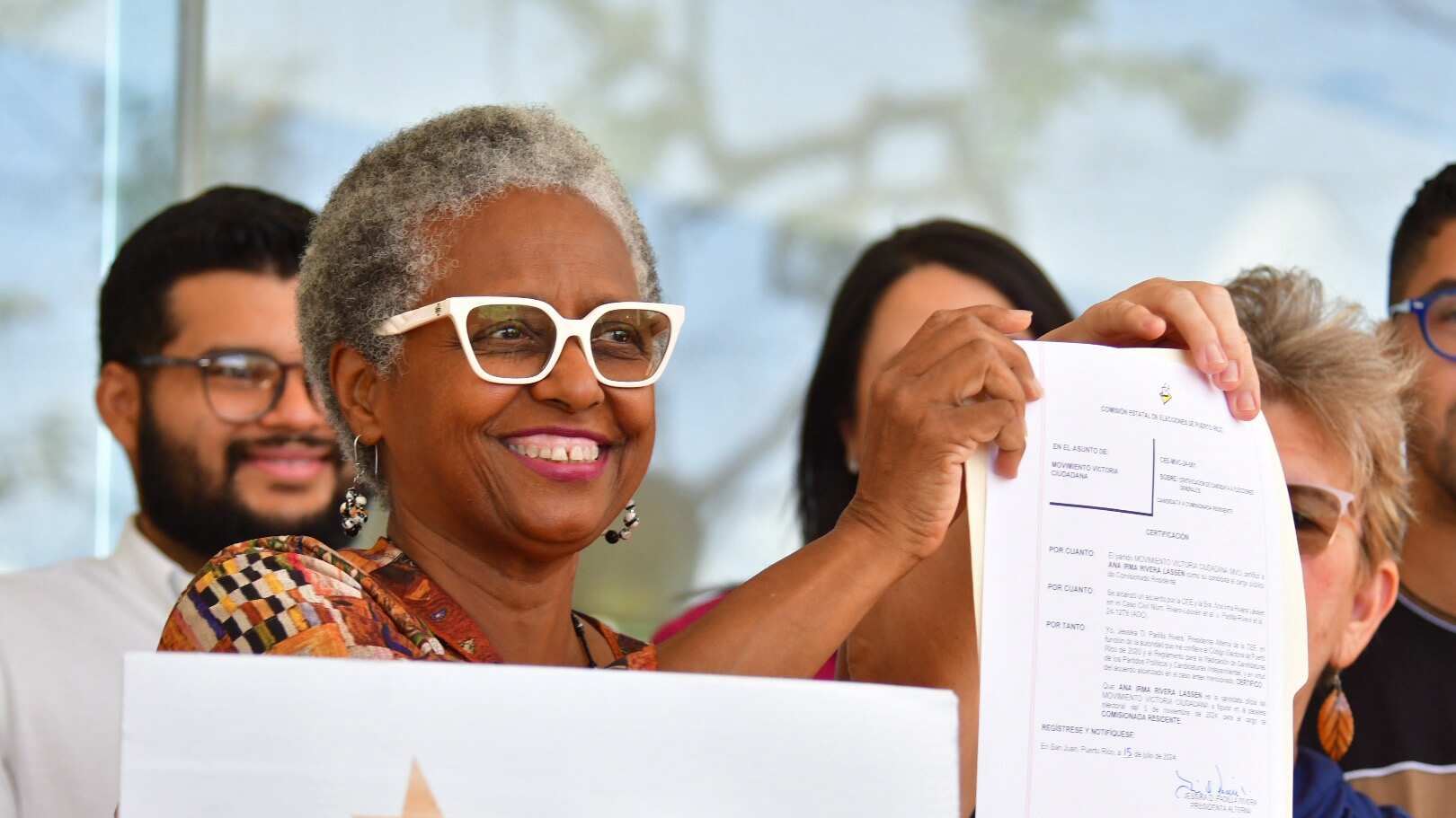“Yo, Jessika Padilla Rivera, Presidenta Alterna de la CEE, en función de la autoridad que me confiere el Código Electoral de Puerto Rico de 2020 y el Reglamento para la Radicación de Candidaturas de los Partidos Políticos y Candidaturas Independientes, y en virtud del acuerdo alcanzado en el caso antes mencionado, CERTIFICO que ANA IRMA RIVERA LASSÉN es la candidata oficial del MOVIMIENTO VICTORIA CIUDADANA a figurar en la papeleta electoral del 5 de noviembre de 2024, para el cargo de COMISIONADA RESIDENTE.”