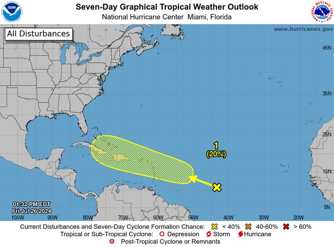 En estos momentos, la probabilidad de formación de un ciclón tropical en las próximas 48 horas es baja, cercana al 0 por ciento. Sin embargo, la probabilidad de formación a lo largo de los próximos siete días también es baja, con un 20 por ciento de posibilidades.