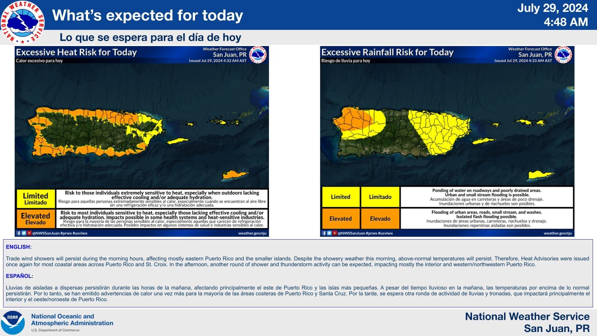 Esta noche, mayormente despejado con chubascos aislados en la tarde, luego variadamente nublado con chubascos dispersos después de la medianoche. Mínimas alrededor de 82 grados. Vientos del este de 5 a 10 mph. Probabilidad de lluvia del 40 por ciento.