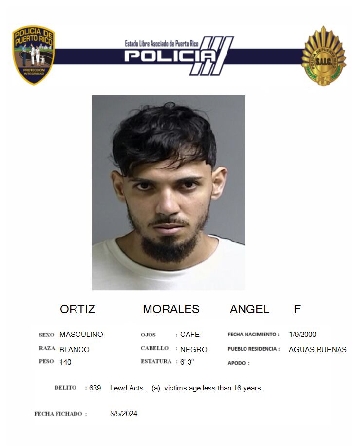 Agentes del Negociado de la Policía de Puerto Rico, adscritos a la División de Delitos Sexuales y Maltrato a Menores del Cuerpo de Investigaciones Criminales (CIC) de Caguas, presentaron cargos contra un hombre, identificado como Ángel Ortiz Morales, de 24 años y residente en Aguas Buenas, por violentar el artículo 133 (Actos Lascivos) del Código Penal de Puerto Rico y 53B (Maltrato) de la Ley para Prevención del Maltrato, Preservación de la Unidad Familiar y para la Seguridad, Bienestar y Protección de los Menores.