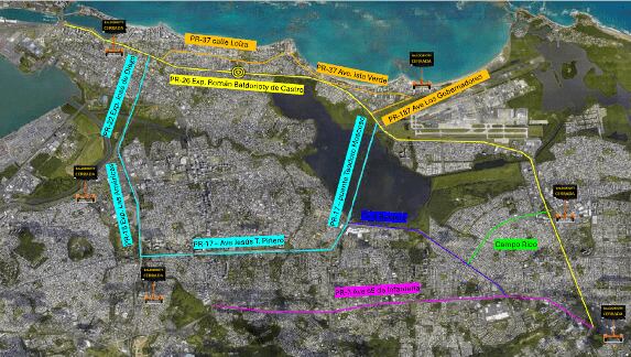 De igual manera los conductores que viajen por la PR-22 y la PR-18 hacia el este de la Isla, deben tomar rutas alternas como los son el Puente Teodoro Moscoso, la PR-3 y la Avenida Campo Rico e Iturregui a través del Ramal 8 (PR-8) y PR-17.