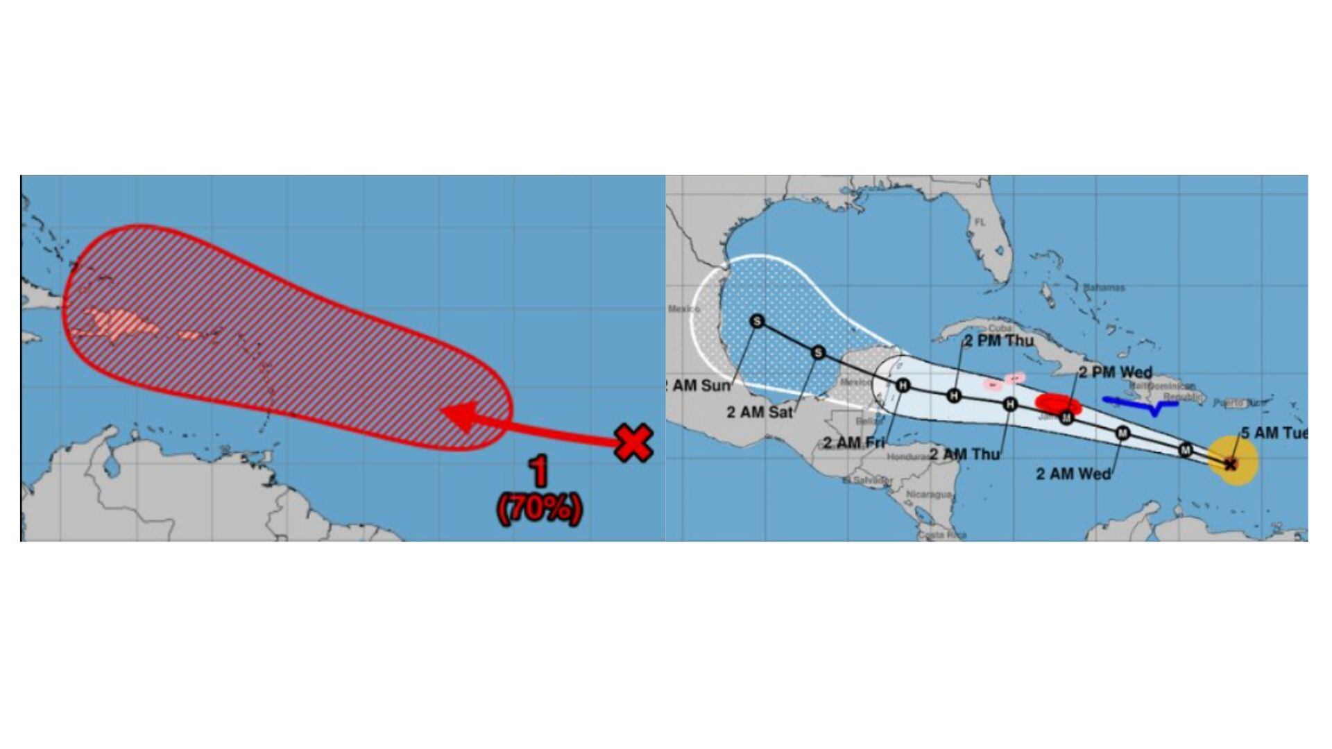 “Esto no es un pronóstico de trayectoria. Representa el área de posible desarrollo de (un) ciclón tropical. También, incluye un pronóstico categórico de la probabilidad de formación, representado por una escala de colores que indica probabilidades bajas (amarillo), medianas (naranja) o altas (rojo) de formación”, detalló la organización.