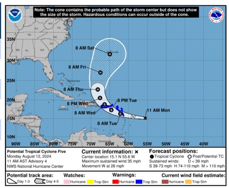 El sistema está a 830 millas al este-sureste de San Juan con vientos máximos sostenidos de 35 millas por hora. Se mueve bastante rápido hacia el oeste a 26 millas por hora.