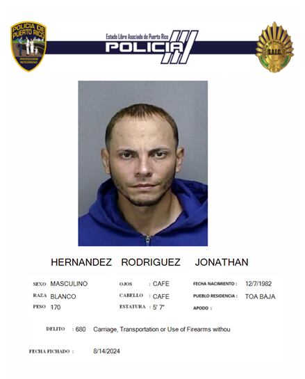 Agentes adscritos al Negociado de Inteligencia y Arrestos Especiales de la Policía de Puerto Rico del área de Bayamón en unión a fiscalía, presentaron cargos criminales contra un hombre, identificado como Jonathan Hernández Rodríguez, de 41 años y residente en Toa Baja. Esto por hechos ocurridos durante tarde del martes, 13 de agosto de 2024, en la barriada Juana Matos, en el pueblo de Cataño.