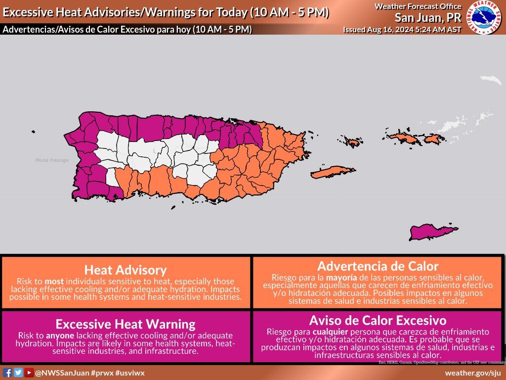 🌡️Avisos de Calor Excesivos y Advertencias de Calor estarán vigentes desde las 10 AM hasta las 5 PM para varias áreas de las islas.#PRwx #USVIwx pic.twitter.com/9PXLJKCbM6